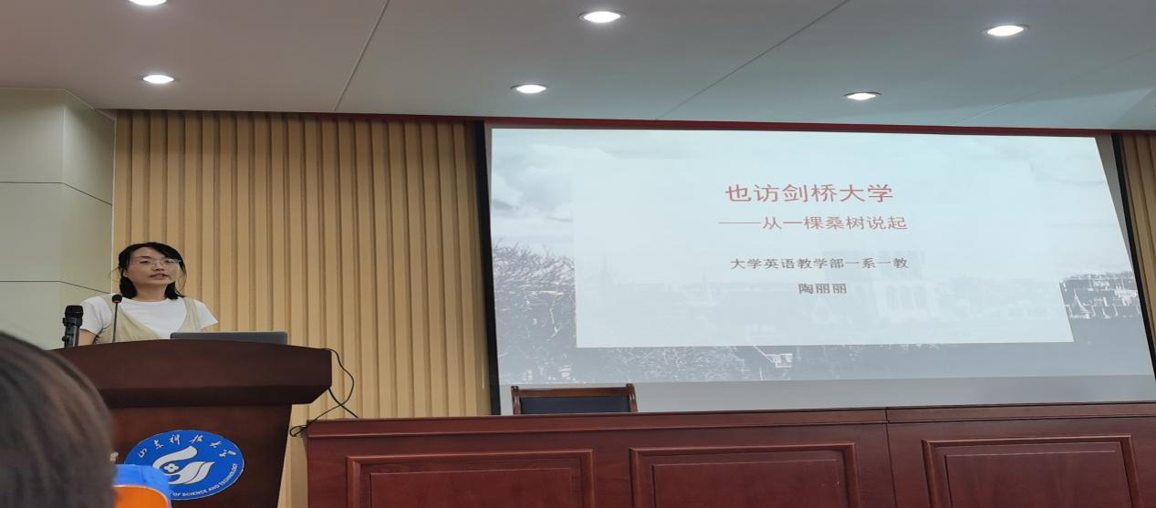 陶丽丽老师以“也访剑桥大学——从一棵桑树说起”为题,从学什么、怎么学、弥尔顿与桑树等方面讲述剑桥大学的浪漫与神秘的魅力、理性与科学的理念,并提出大处着眼、小处着手、世界意识与中华特色相结合的文化走出去的观点。