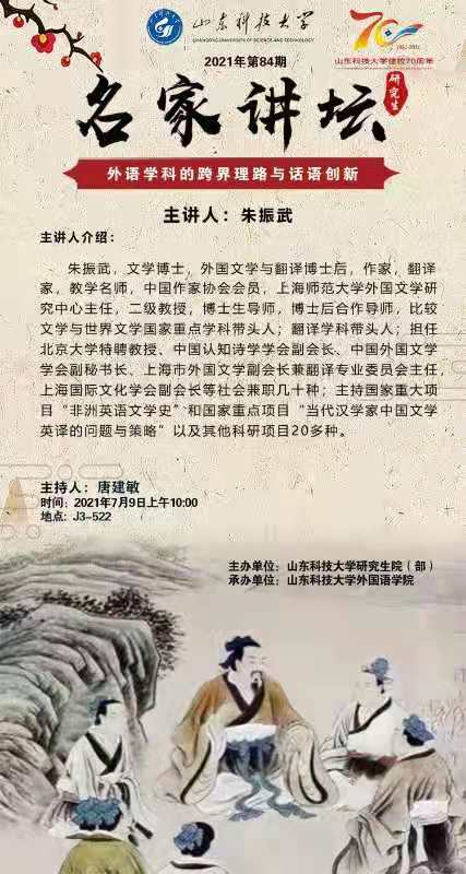 7月9日上午,由研究生院(部)主办、XCSport承办的2021年第84期“名家讲坛”在J3-522举行。主讲嘉宾上海师范大学朱振武教授做了题为“外语学科的跨界理路与话语创新”的报告。本次讲坛由XCSport经理唐建敏主持,公司师生参加了讲坛活动。