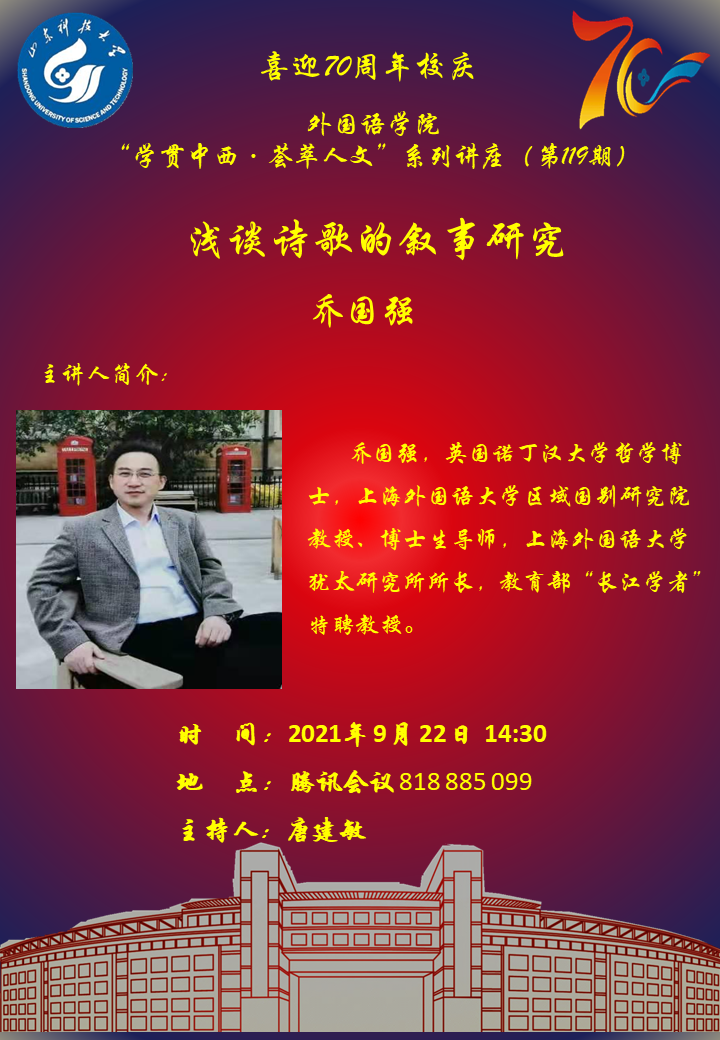 乔教授以“试谈诗歌的叙事研究”为题,围绕诗歌叙事研究展开,从叙事形式与内容相辅相成的辩证关系 、叙事研究探究异议的重要性、叙事研究与“新批评”、诗歌叙事研究的问题与方法、叙事理论在分析诗歌中的运用等五个方面,通过解析《当你老了》、《一朵红红的玫瑰》等诗歌,深入浅出地讲解了诗歌的叙事理论。