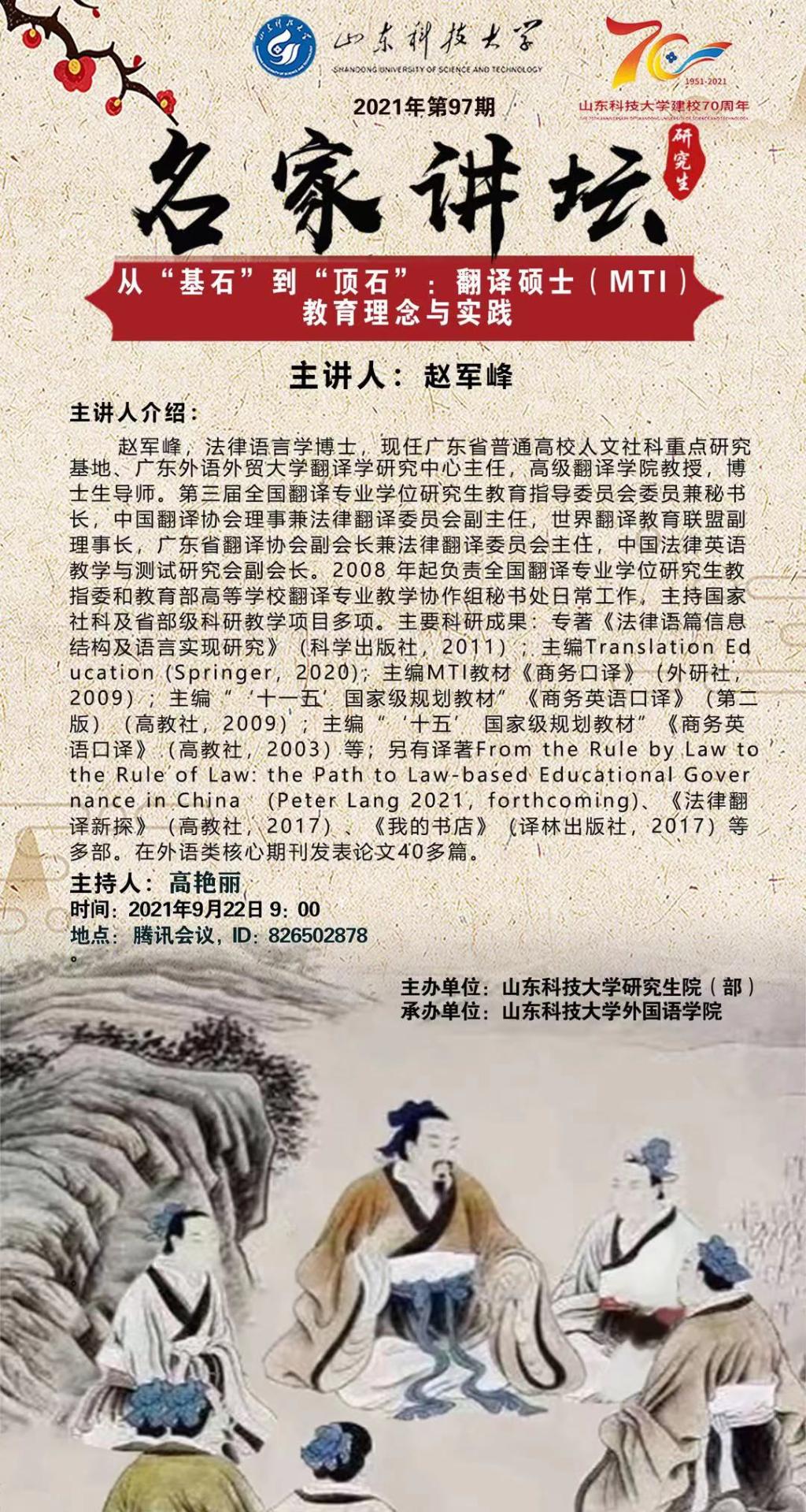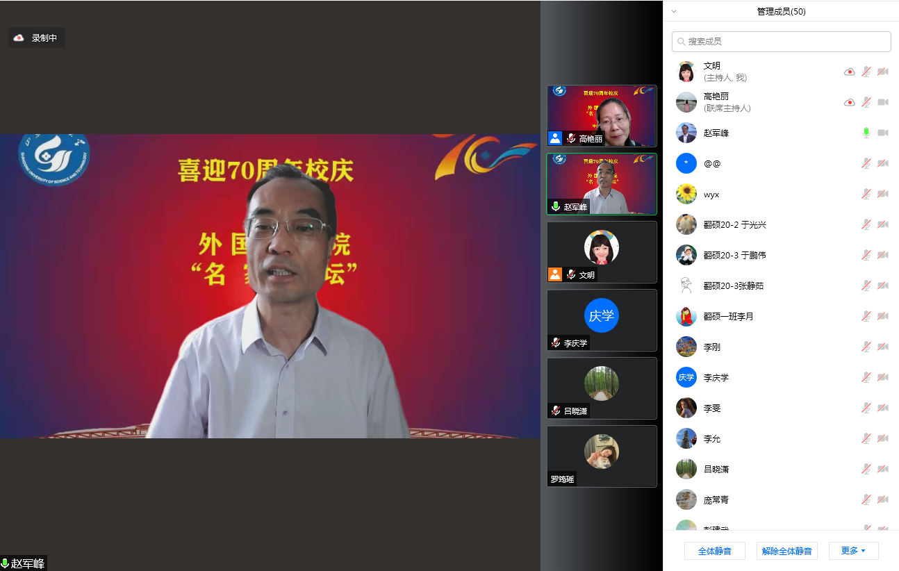 在XC体育70周年校庆来临之际,外语公司举办系列学术讲座献礼校庆,为教师和员工献上丰盛的精神盛筵。作为系列讲座的第一讲,9月22日上午由研究生院(部)主办、XCSport承办的2021年第97期“名家讲坛”在腾讯会议平台上如期举行。