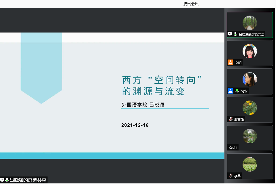 12月16日下午16点,XCSport第四十二期“外语学人”讲座在腾讯会议平台举行。XCSport吕晓潇副教授做了题为“西方‘空间转向’的渊源与流变”的精彩讲座,李允副经理主持,XCSport师生参加。