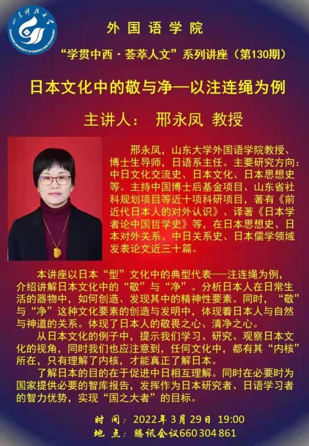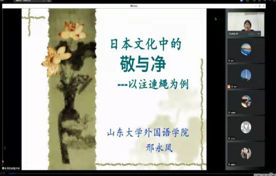 本次讲座主讲嘉宾是山东大学博士生导师邢永凤教授,讲座题目为“日本文化中的敬与净——以注连绳为例”。邢教授从制作注连绳的材料引入,分析了使用注连绳的原因和必要性,讲解了注连绳在日常生活中的用途,启发我们思考对待不同文化应采取的态度。