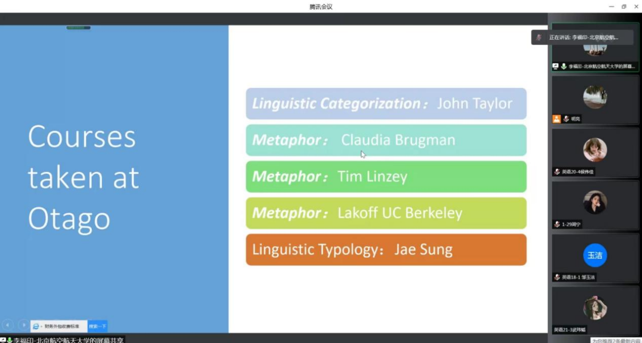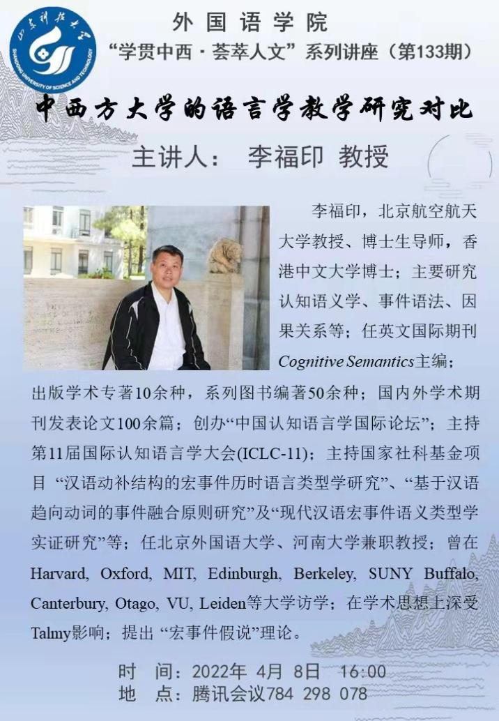本次讲座主讲嘉宾是北京航空航天大学博士生导师李福印教授,讲座题目为“中西方大学的语言学教学研究对比”。李福印教授通过自己在哈佛大学、麻省理工公司、加州大学伯克利分校、牛津大学、爱丁堡大学、天主教鲁文大学等诸多世界一流名校的语言学系深造、访学及研究的经历,围绕“语言学”这一核心话题讲解了英语学习、文化冲突、语言学课程、语言学研究、研究领域的确定与拓展等方面的内容。