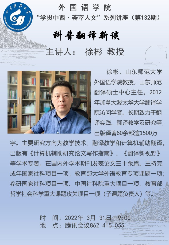 本次讲座主讲嘉宾是山东师范大学翻译硕士中心主任徐彬教授,讲座题目为“科普翻译新谈”。徐彬教授指出,科普翻译具有三方面挑战,即科普文本的科学性、文学性和普及性。在科普翻译中,如缺乏整体策略的指引,只是见词翻词、见句译句,只知口念“拆”“合”的要诀,难免不够精准;如有成熟的策略,则可成竹在胸,美文佳译,一气呵成。