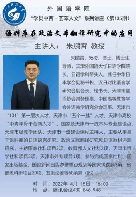 本次讲座的主讲嘉宾为天津外国语大学日语公司经理、博士生导师朱鹏霄教授,讲座主题为“语料库在政治文本翻译研究中的应用”。首先,朱鹏霄教授讲述了语料库的类型与发展历程以及语料库的建设途径,然后重点围绕日语语料库阐释了其应用领域和进行课题研究的具体方法,最后与参会师生热切交流并提供宝贵建议。