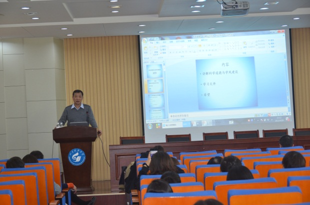 彭建武教授从解释什么是科学道德与学风问题切入,指出高校师生应坚持诚实、公开、公正的原则,严于律己。随后,彭教授着眼外语学科科研现状,提醒公司师生尤其注意引文规范、研究成果署名规范和投稿过程规范。为加深与会师生对科研诚信的理解与认识,彭建武教授援引科研不端行为具体案例,告诫师生警惕因疏忽而造成的科研不端行为。