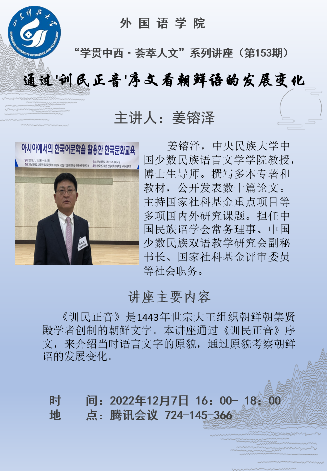 本次讲座的主讲嘉宾为中央民族大学教授、博士生导师姜镕泽,讲座主题为“通过'训民正音'序文看朝鲜语的发展变化”。姜镕泽教授通过大量丰富的举证,详细地阐释了《训民正音》的序文,介绍了当时语言文字的原貌,并通过原貌考察了朝鲜语发展变化的规律和规则。在提问环节,姜镕泽教授与朝鲜语系师生展开了热烈讨论,并就朝鲜语学习方法提出了意见和建议,尤其强调了语言基本功的重要性。