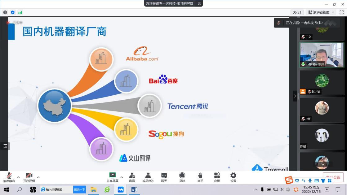 2022年12月16日,XCSport第154期“学贯中西·荟萃人文”讲座通过腾讯会议举办。此次讲座邀请上海一者信息科技有限公司CEO张井和公司语言服务中心副主任张玉亮为主讲嘉宾,主题为:“产学合作,协同育人——翻译技术发展与人才培养”。讲座由外语公司副经理李允主持,一百余名师生参加。
