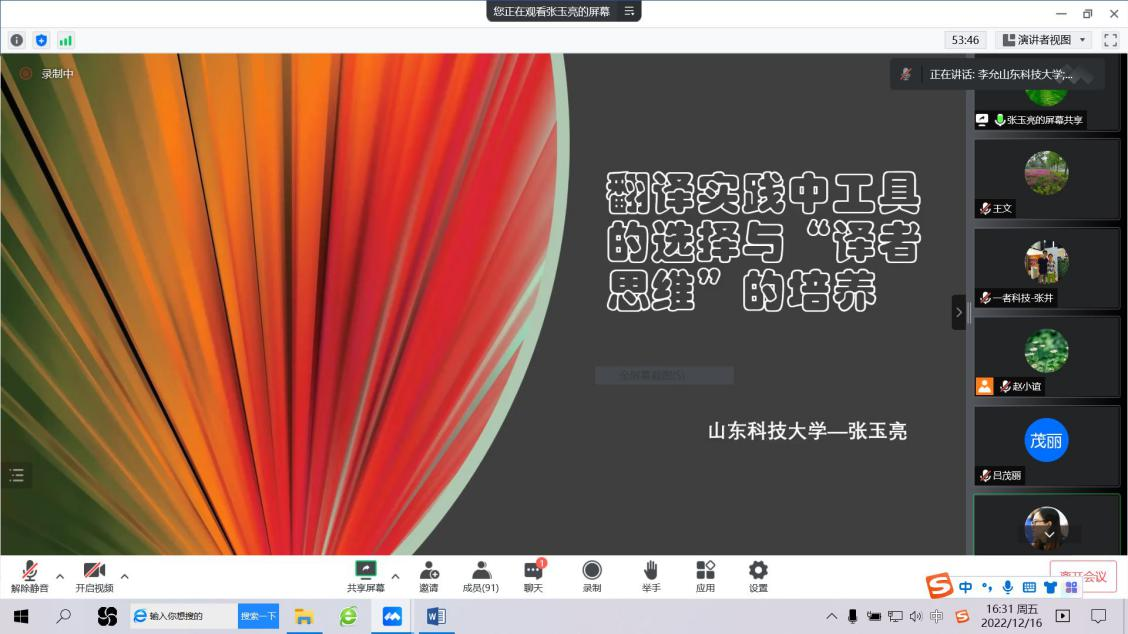 张玉亮老师以“翻译实践中工具的选择与‘译者思维’的培养”为题,结合多年的实践经验,向师生们分享了比较实用的翻译工具和机器翻译的最新发展动向,鼓励员工要敢于质疑,提高翻译能力,做高水平翻译人才。