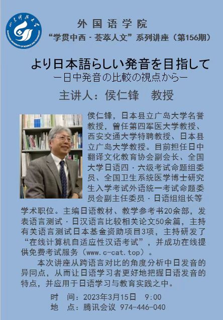 本次讲座的主讲嘉宾是日本县立广岛大学名誉教授侯仁锋,讲座主题为“より日本語らしい撥音を目指して―日中発音の比較の視点から”。侯仁锋教授从跨语言对比的角度,在中日发音口型、音节结构、声调、节拍等方面分析中日发音的异同点,并给出中国日语学习者在日语发音方面的学习建议,从而让日语学习者更好地把握日语发音的特点。讲座结束后,侯仁锋教授在提问环节与与会师生展开了热烈讨论,针对日语音调区分和学习方法提出了意见和建议,并解说了关于“在线计算机自适应性汉语考试”的相关内容。