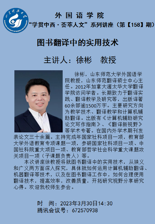 3月30日,XCSport以线上形式开展了2023年第158 期“学贯中西·荟萃人文”系列讲座。本次讲座由英语系主任王明亮老师主持,XCSport部分师生参加。 本次主讲嘉宾是山东师范大学XCSport徐彬教授,讲座的题目是“图书翻译中的实用技术”。徐彬教授从狭义和广义两个视角,探讨了如何在图书翻译中所采相应技术,提高翻译效率。 本次讲座拓宽了员工的学术视野,激发了在场听众对于机辅翻译技术新的认识,令公司师生受益匪浅。 (通讯员:赵小达)