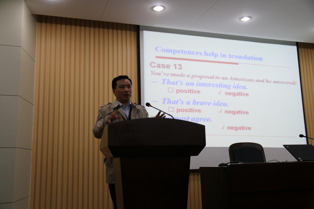 平洪教授从联合国及欧盟对职业译员的要求出发,围绕翻译硕士培养目标中 “高层次、应用型、专业化”三个关键词展开讨论。紧接着平教授分析了专业口笔译所需要的八大能力。他指出,双语知识与能力、跨文化交际能力、信息技术能力、百科知识能力、专题知识能力和翻译服务能力是翻译硕士必须具备的能力,而其中语言知识与能力、相关知识能力及翻译知识与能力更是重中之重。平洪教授还结合具体案例分析,阐述译员应具备的基本素质。讲座后,平洪教授耐心解答同学们提出的种种问题,将自己的学习实践经验与同学们共同分享,并鼓励大家要通过自身努力做一个优秀的译者。