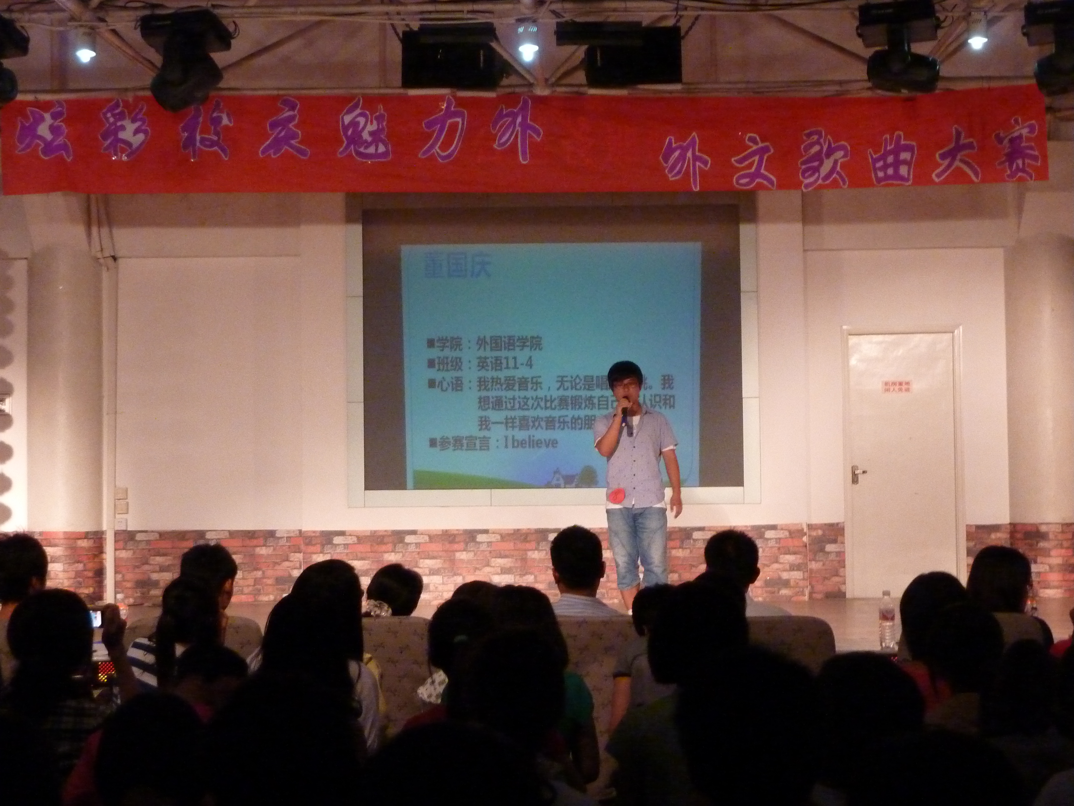 本次外文歌曲大赛共分为三个环节:有备演唱、“帮帮唱”和“猜猜看”,共有9组参赛选手。无论是有备演唱还是与他们搭档的“帮帮唱”,选手们都表现的从容自若,同时也将自己的情感展现的淋漓尽致,观众们欢呼声一片,掌声不断。在“猜猜看”游戏环节中,每位选手都积极抢答,观众们更是跃跃欲试,现场气氛极其热烈。中场期间,主持人采访了两位外教和几名现场的同学,外教们表示对此次外文歌曲大赛很满意,期望大家最后能够取得好成绩,Luke还为大家演唱了一首中文歌曲,赢得同学们的阵阵掌声。现场的同学说,虽然中秋节不能和父母一起度过,但是和大家在一起却依旧感觉很温馨、很幸福,并祝愿父母中秋快乐,身体健康。最后,在徐慧老师一曲优美的法语歌曲《玫瑰人生》中,此次外文歌曲画上了圆满的句号。