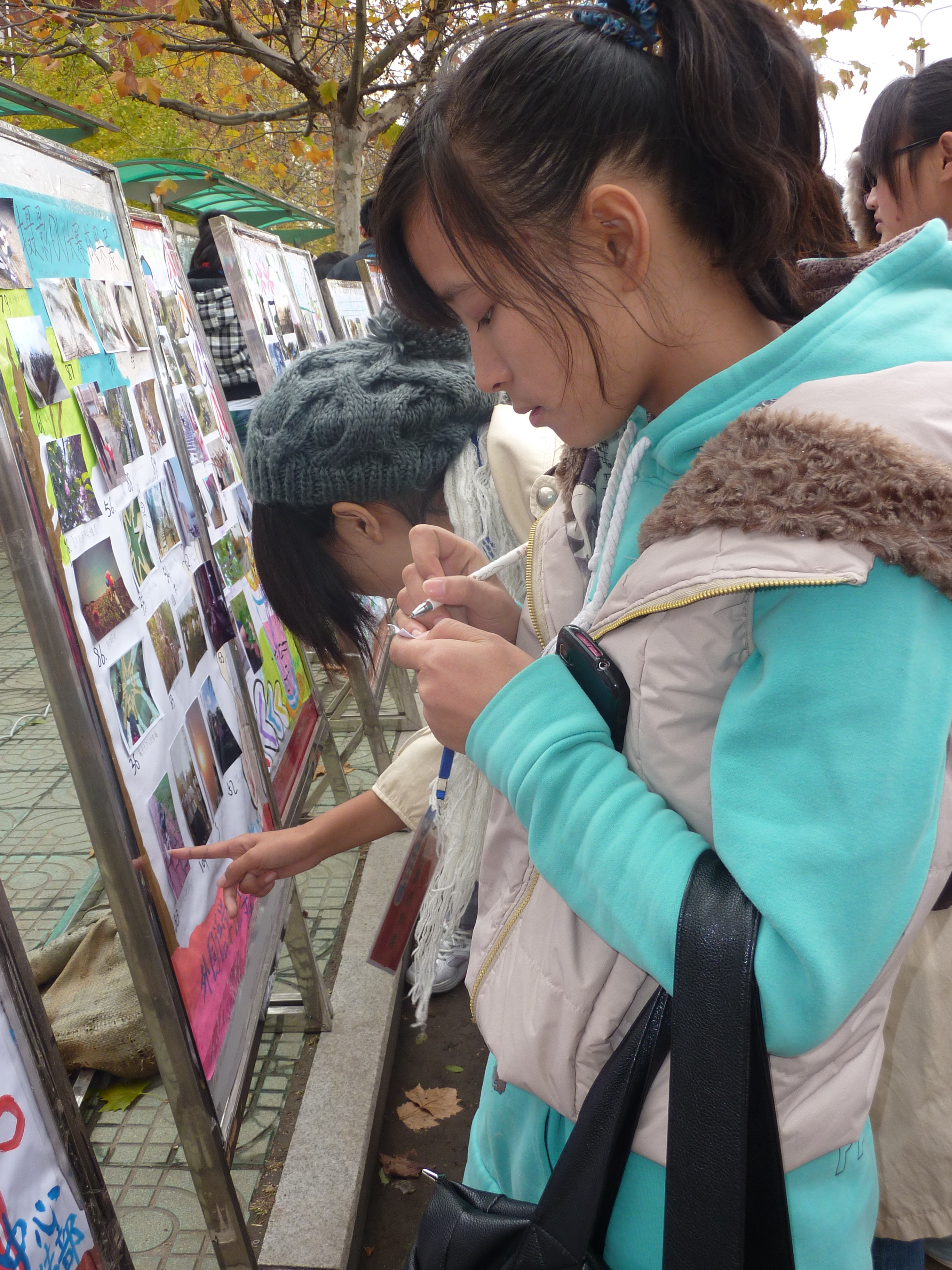 在作品展出时,过往的老师同学积极参与活动投票。在众多参赛作品中,34号作品《幸福》吸引了众多人的目光,照片中一堆老夫妻手牵手相携前行的背影让人体会到了幸福的真谛。许多人都被这幅作品所感染,为其投票。在众多投票者中,一位英语外教对待投票格外认真,他将把各幅作品认真看过一遍之后,默默记下作品序号,最后郑重地把选票投到投票箱中。