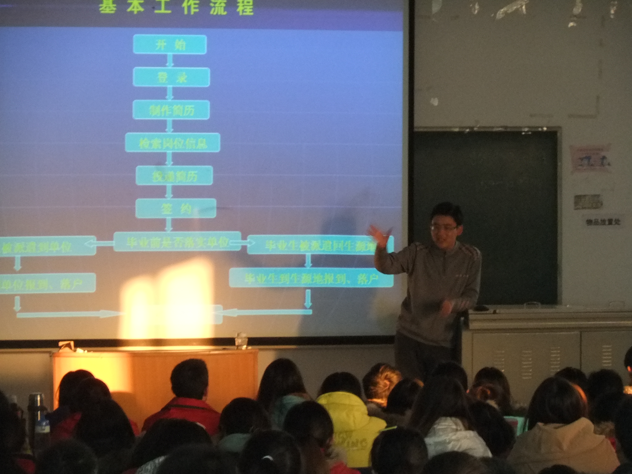 刘亮亮首先为全体毕业生讲解了“工作的基本流程”,并详细就其中简历投送、辨别招聘信息真伪、面试竞争就业、合理安排工作事项等方面进行了讲解。同时,就老员工存在的就业误区,就业难问题作出深刻的分析与系统的指导。之后又结合幻灯片演示,为同学们具体示范了如何正确使用就业信息系统。老师的讲解诙谐幽默,同学们的提问积极踊跃,讲座气氛热情洋溢,同学们受益匪浅。