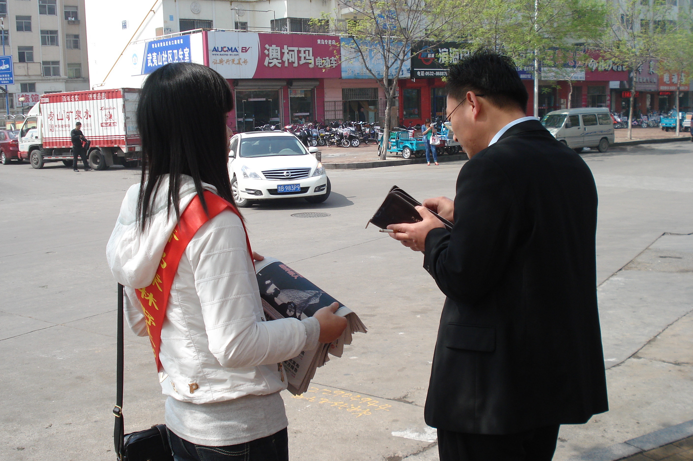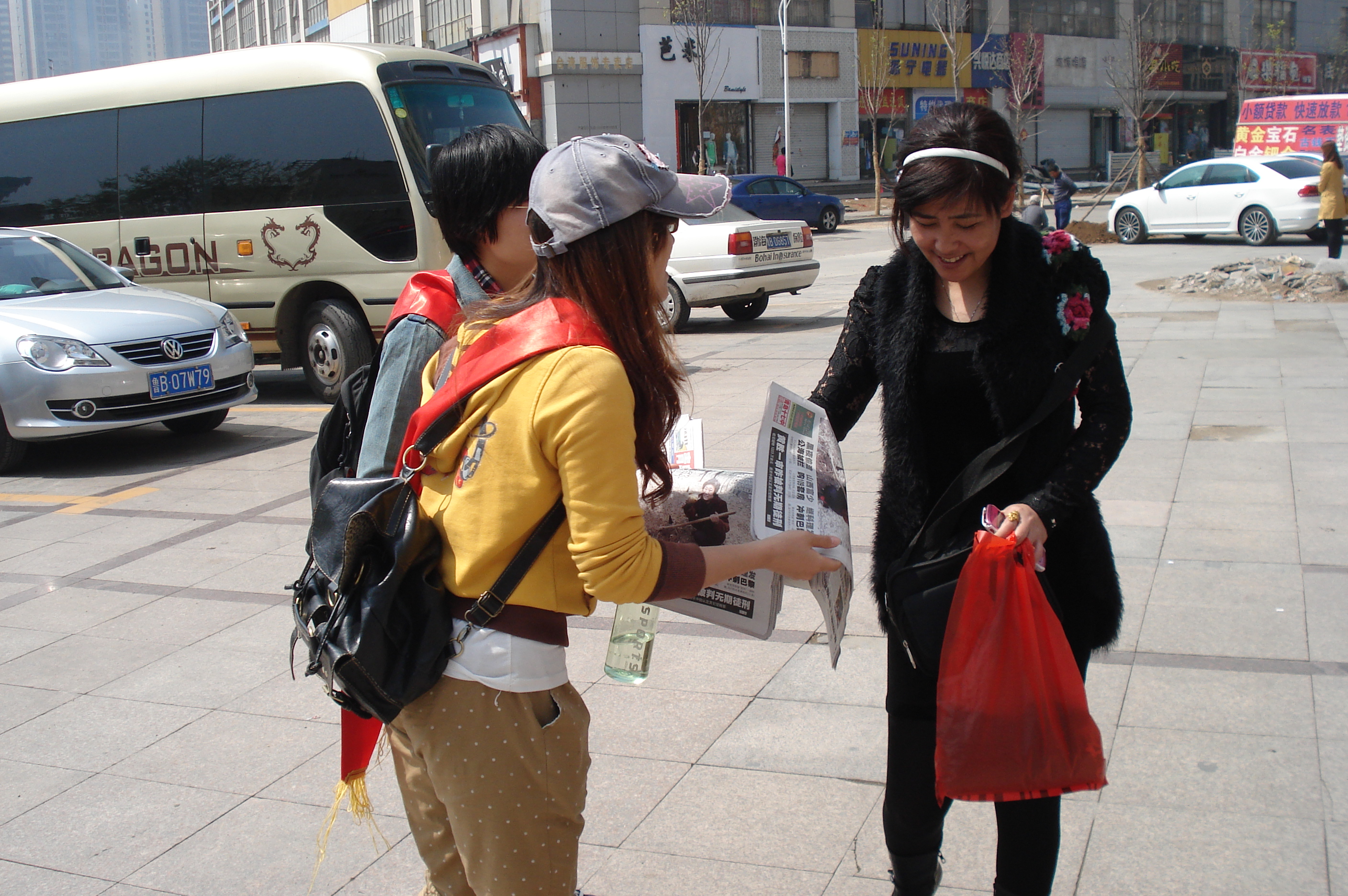 各位青年志愿者以饱满的热情投入到此次报纸义卖活动中。志愿者们以小组为单位,佩戴统一的绶带,分组、分地点走上街头进行义卖募捐活动。志愿者们手拿报纸,微笑着向来往路人介绍此次活动的重要意义,希望他们能买下一份报纸,献出一份爱心,帮助古城村的小朋友们更好地学习与生活。此次活动收到了广大市民的积极回应,许多善良的市民捐出善款,却不要报纸,希望同学们通过卖出这些报纸,募集到更多善款支援幼儿园的重建;有的市民以100元的高价买一份报纸,希望可以通过自己的努力来帮助灾区重建。