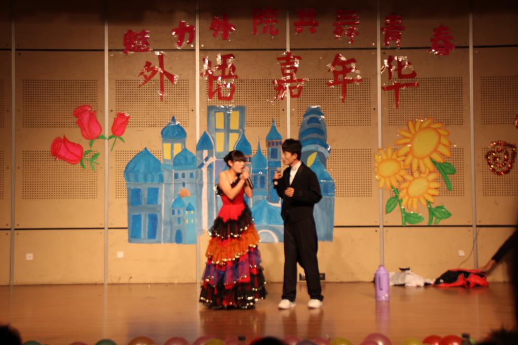 晚会在全场师生的期待中拉开帷幕,健美操协会的精彩舞蹈率先开场,瞬间点燃全场气氛。随后各类节目精彩纷呈,来自各个语种的同学带来的小品《白娘子传奇》、《泰坦尼克号》和《韩语考试》题材新颖,笑料不断。青春动感的舞蹈《Crazy》,超凡脱俗的英文歌曲《Back to December》紧紧吸引着观众的眼球,中场主持人带领观众做的小游戏抢凳子2.0升级版得到了现场观众的热烈响应。最后,由英语、日语和韩语协会会长合一曲《爱因为在心中》,在唯美的歌声中本次晚会画上了圆满的句号。