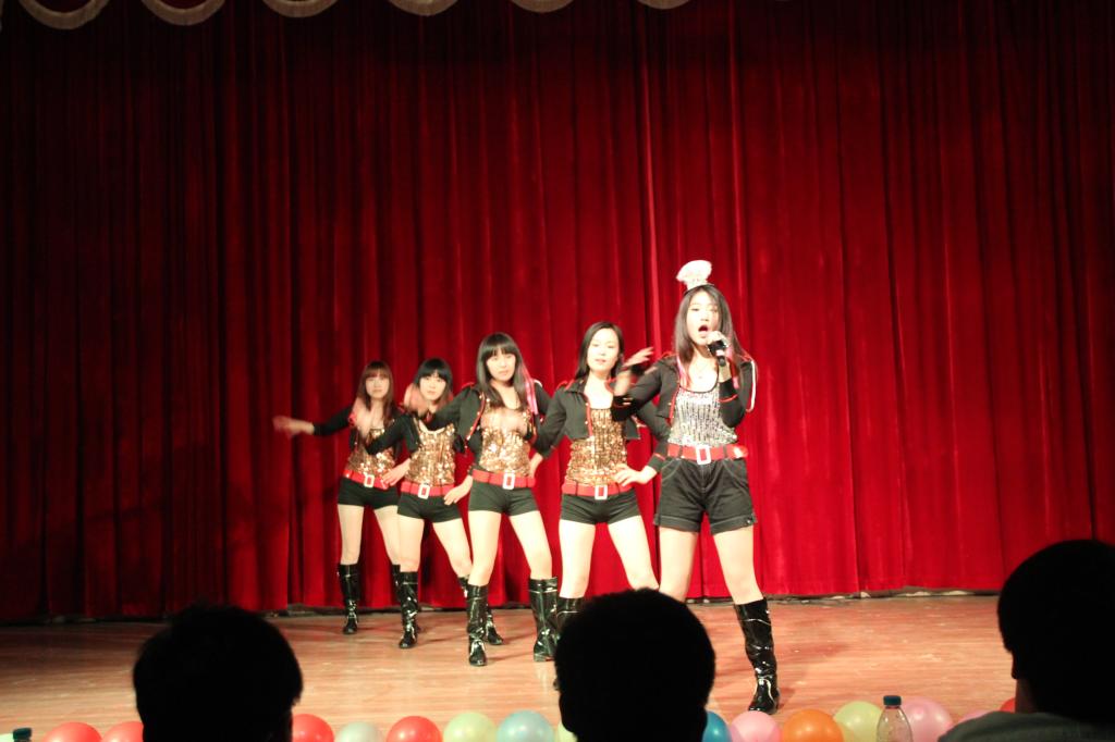 英日韩三曲华丽联唱拉开了本次大赛的帷幕,比赛分为两个环节,第一环节由参赛的十组选手依次上台展现才艺,男女组合的抒情歌曲,清新系的可爱舞蹈,性感火辣的爵士舞,异域风情的印度舞等节目精彩纷呈;第二环节则将十组选手分成A、B两队,每队的选手自由组合,通过唱歌和跳舞两两比拼。一番激动人心的劲歌辣舞之后,A队分数遥遥领先,大赛步入高潮阶段。最后,副主席田召金为在场观众献上了两首歌曲,为本届外文歌舞大赛画上了圆满的句号。第三组的曹铭烁、夏青和第十组的方馨、杨慧选手荣获本次大赛一等奖。