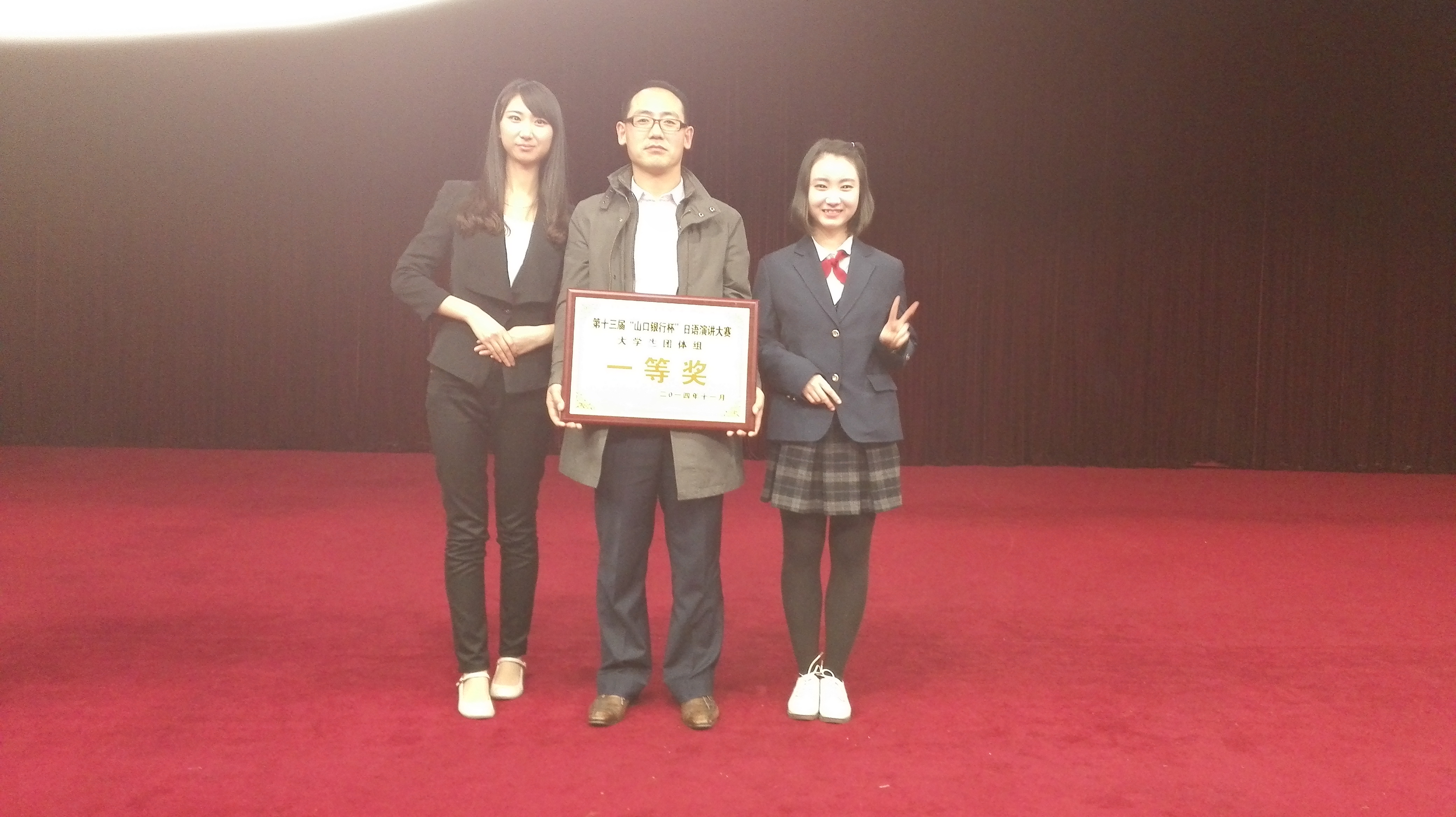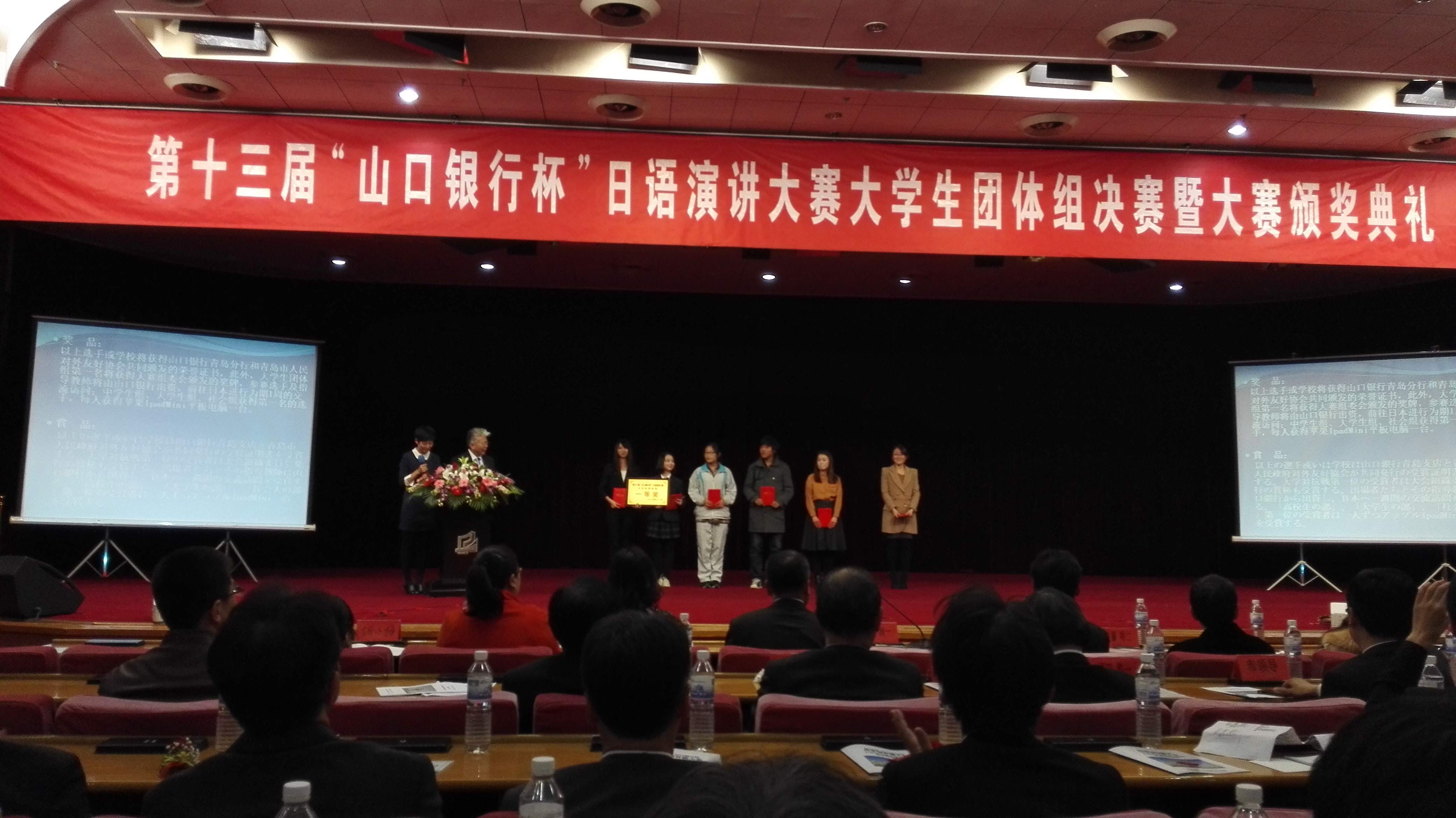 在11月15日于青岛市府新大厦举行的第十三届“山口银行杯”团体决赛中,公司日语系的薛婧宇和蒋云艺同学经过激烈的角逐,夺得了本届大赛团体一等奖。取得了公司自参加该赛事以来的最好成绩。 值得一提的是,薛婧宇同学在比赛中临场发挥出色、个人成绩最高,其能力和水平获得了日本山口银行总行行长福田浩一先生和日本国驻青岛总领事馆总领事远山茂先生的一致肯定。 本届决赛共有包括中国海洋大学在内的驻青5所高校参加。(通讯员:陈昌柏)
