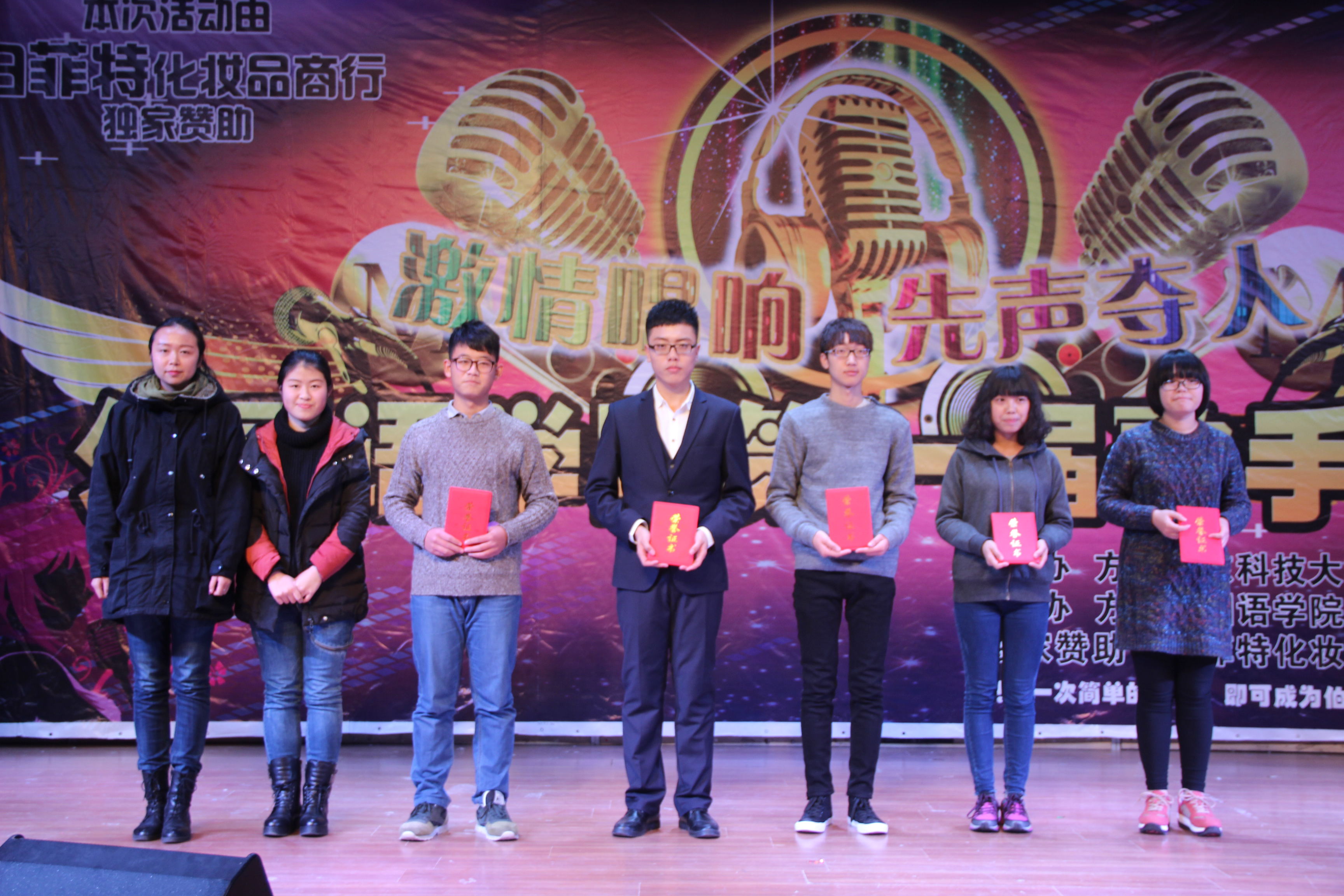 经过初赛的激烈角逐和层层选拔,共有10位选手脱颖而出角逐冠军。本次比赛共分三个环节:先声夺人,最美和声,激情唱响。决赛的场面异常火爆,怀揣着激情与梦想,选手们一上台便让在场所有人感受到他们展现才华的渴望和洋溢青春的热情。歌曲《我想大声告诉你》拉开比赛帷幕,台下同学们热情高涨,呐喊着为每一位选手加油助威。《pretty boy》、《海阔天空》、《梦一场》等一首首青春洋溢的歌曲使现场气氛活跃,吉他伴奏《奇妙能力歌》带我们领略民谣的魅力;充满激情的《喜欢你》婉转悠扬荡人心肠;轻柔的《时间煮雨》温柔动听。而第二环节“最美和声”中,选手们配合默契,唯美的《屋顶》带我们走进浪漫的爱情,汉字和萌妹子组合给我们带来不同风格的《Yellow》,余音绕梁引发观众掌声连连。期间,校大艺团声乐队副队长付凯林为观众奉献上了一首精彩的歌曲,舒缓了紧张的比赛气氛。第三环节由前两轮综合得分前五名的选手激情演绎,选手们用歌声传达梦想,唱响好声音。最终王丹利凭借出色的表现获得了本次比赛的冠军,邓胜杰获得第二名,邴晓彤获得第三名,董志远等获得优秀奖。曾绍顺获得本场最佳气质奖,莫洁钰斩获最佳潜力奖。(通讯员:韩睿鹏 李成明 崔腊梅)