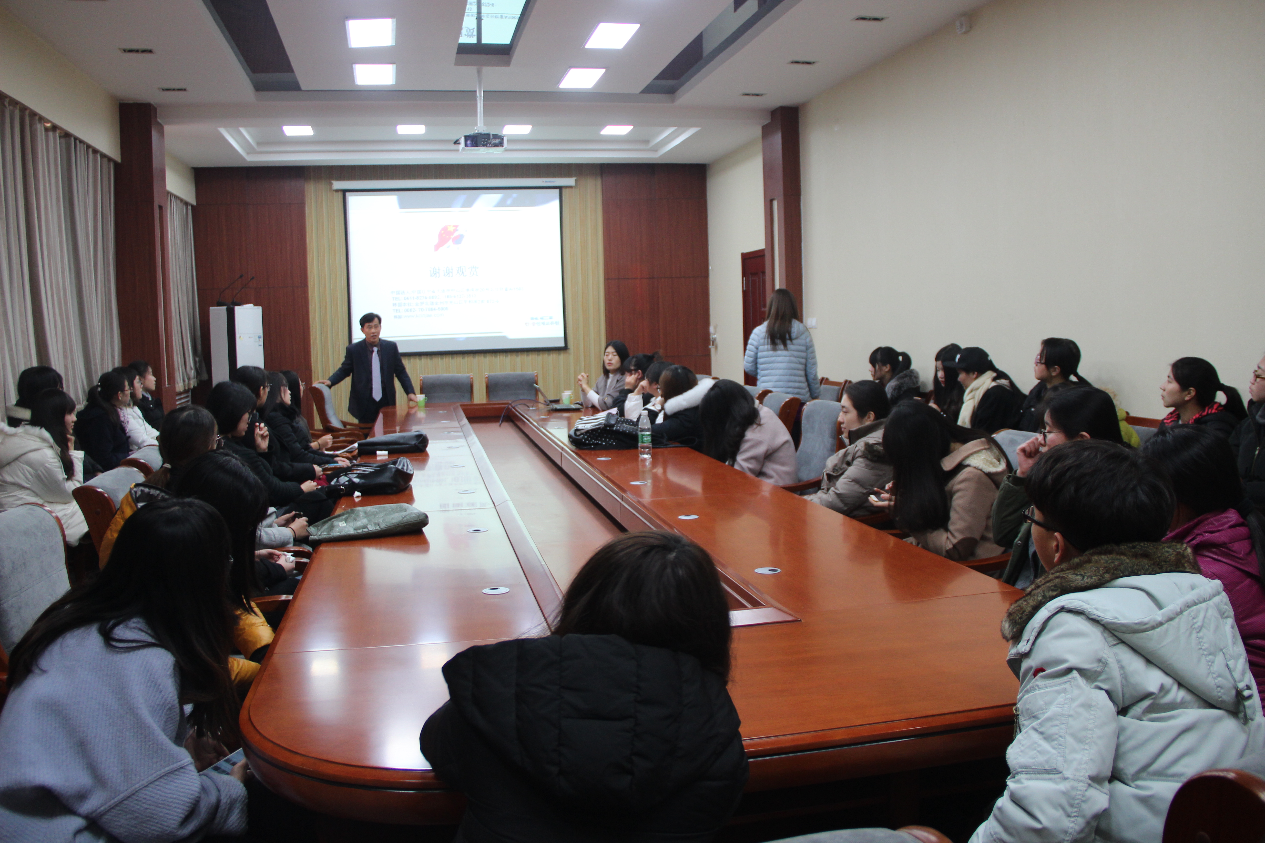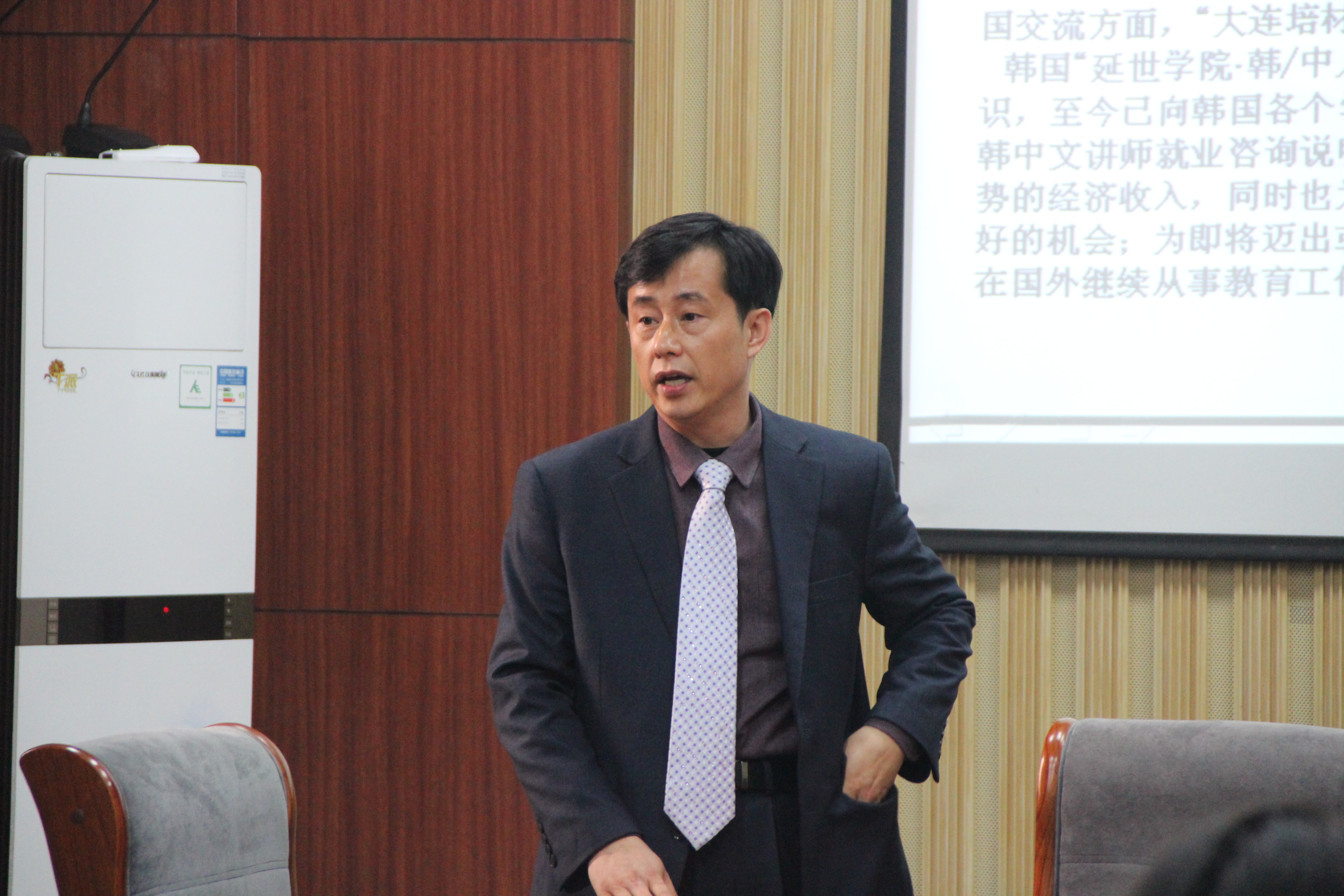 郑有福教授向大家简单地介绍了有关于韩国培才大学的历史以及目前的发展状况,并且就同学所关心的就业问题做出了说明。郑教授重点向大家讲述了有关于赴韩中文讲师的发展前景以及韩国政府对此的优惠政策。郑教授表达了希望同学们以后可以成为中韩之间交流合作的连接桥梁的愿望。