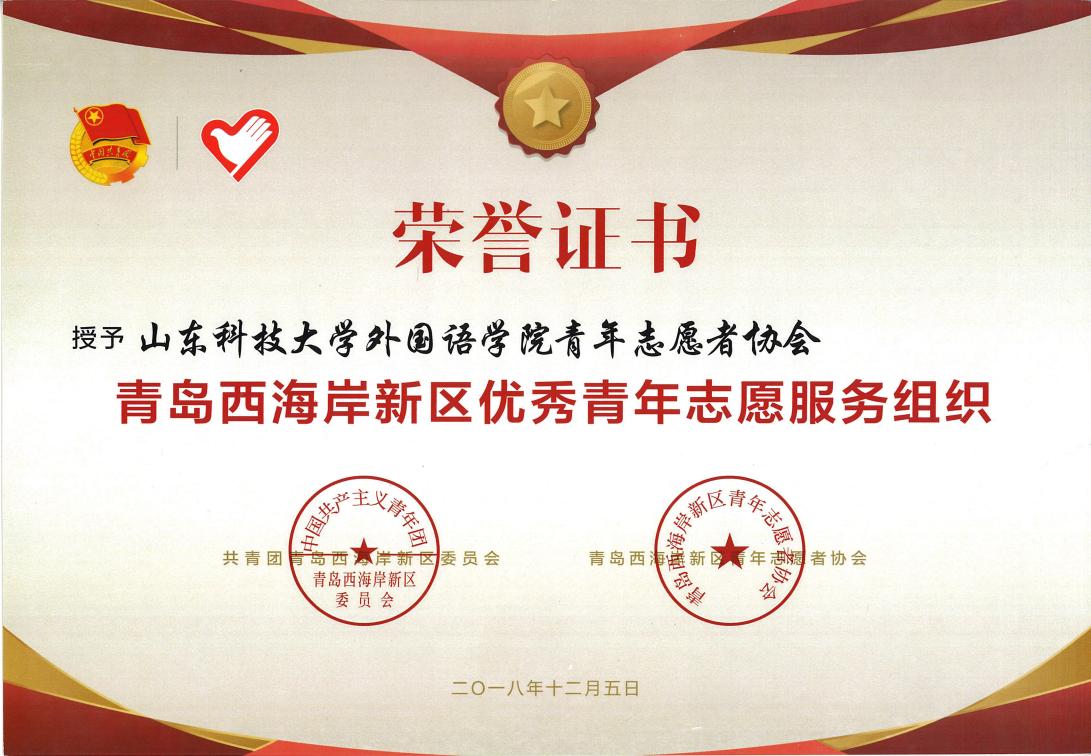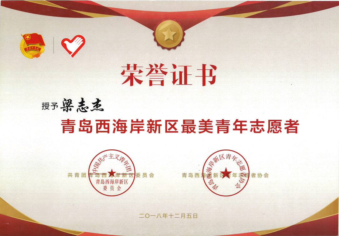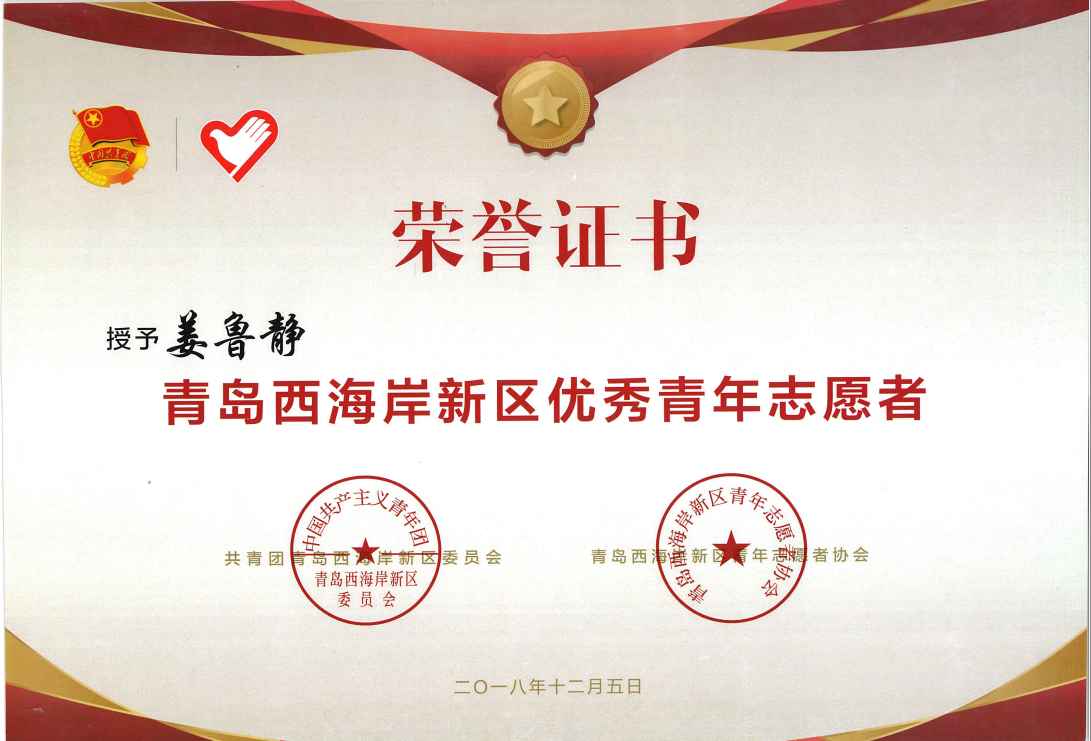 在共青团青岛西海岸新区委员会组织开展的2018年最美青年志愿者、优秀青年志愿者、优秀青年志愿服务组织、优秀青年志愿务项目评选活动中,公司青年志愿者协会获“青岛西海岸新区优秀青年志愿服务组织”;梁志杰、姜鲁静获“青岛西海岸新区最美青年志愿者”。