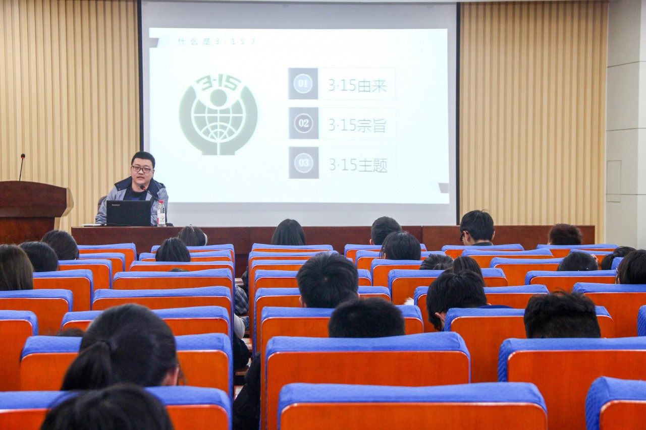白镇源老师从“什么是3·15”、“3·15离我们远吗”等五个方面向同学们详细介绍了“3·15”权益服务日。首先讲述了它的由来、宗旨和主题,并且列举了近几年“3·15”晚会上出现的事件主角,例如:高德地图、肯德基、饿了么等等。接下来白镇源老师请同学们讲述了自己身边遇到的有关权益问题的事例,最后一一解答了同学们关于权益的一些疑问。