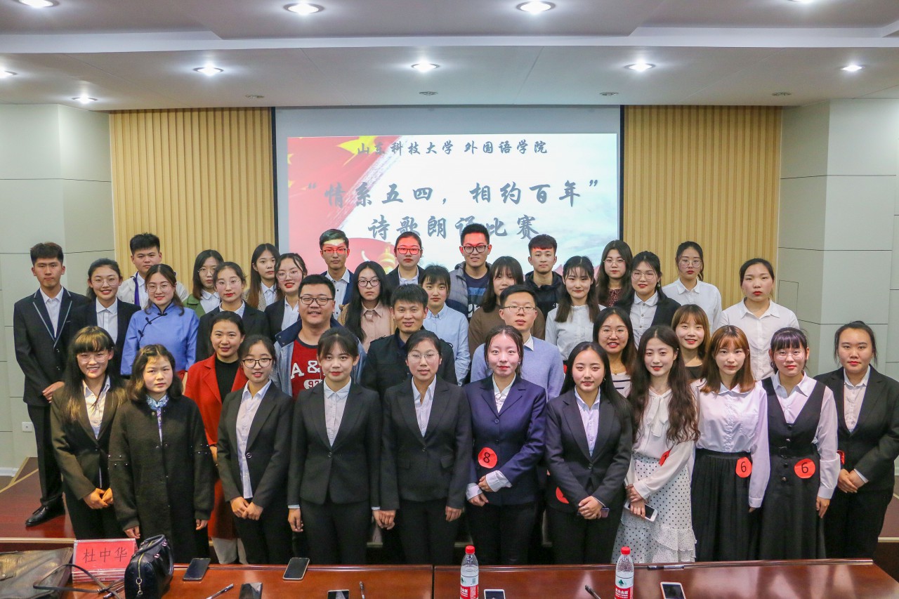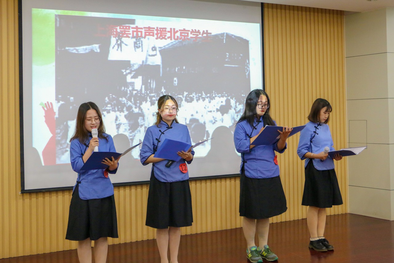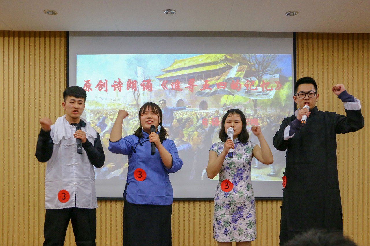 比赛现场气氛热烈,同学们热情高涨。选手用古体、现代、散文等不同的诗歌文体表达着他们对五四运动的赞誉和对五四精神的崇尚。有的选手精心改编,尽情抒发着青年的爱国主义情怀,让人仿佛看到了五四青年追求真理、不畏牺牲的豪迈;有的选手引经据典,饱含深情地回顾历史,带领我们走入那个扣人心弦、轰轰烈烈的时代;有的选手声音铿锵有力,举止大方得体,通过古今对比彰显祖国发展的繁荣昌盛。经过评委打分,评出一等奖两组,二等奖四组,三等奖六组。