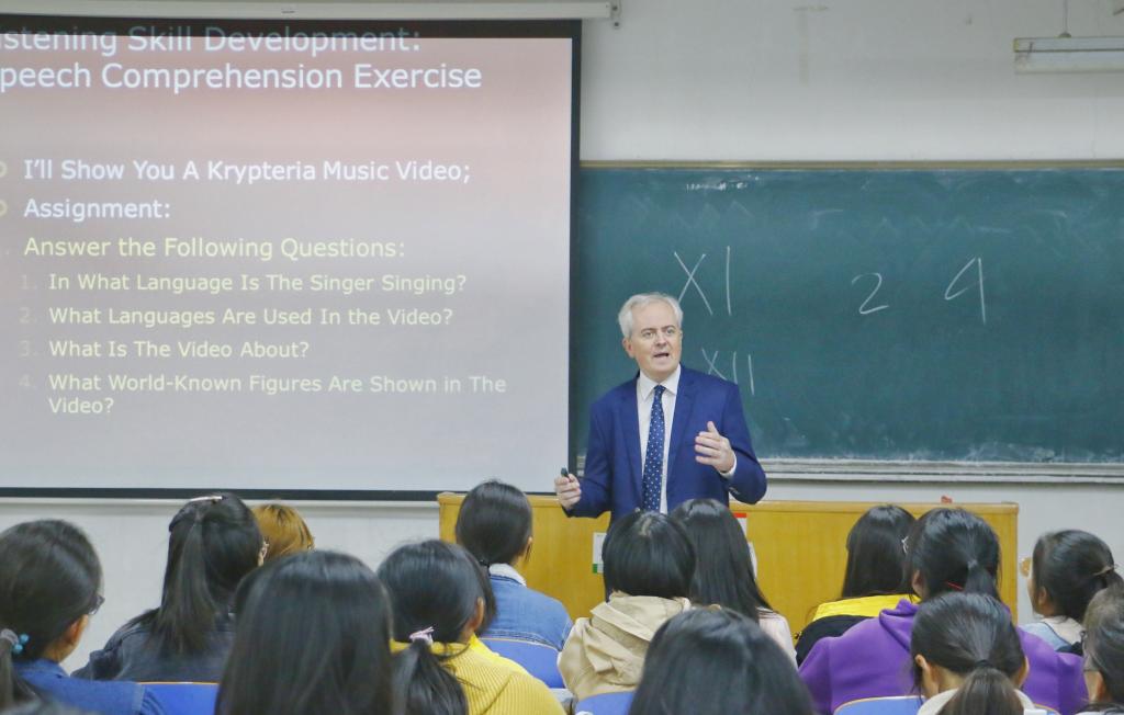 首先,外教Logor做了简短的自我介绍,并以轻松幽默的方式点出了本次讲座的主题“Culture Shock and Adaptation”。为了使同学们进一步了解英语文化,外教Logor通过放映PPT、讲述经历、分享故事等多种形式突出本次讲座的主题。之后,他还分别从文化的定义出发,在社会关系、肢体语言、价值观等方面带领同学们认识了中外文化冲击,介绍了自己在经历这些文化冲击的切身感受,使同学们对文化的差异性有了更加直观的感受。他幽默诙谐的语调以及生动活泼的动作使同学们听得津津有味,现场气氛活跃,不时响起阵阵掌声。Logor还分享了让同学们能更加深入了解文化差异的视频,使现场气氛走向高潮。随后,Logor分析了文化差异带来的影响以及人们面对文化差异时心理的变化情况。最后,外教Logor分享了自己的心得体会,他鼓励同学们试着去了解文化差异,并且战胜文化差异带来的影响,以积极的心态去适应世界,以美好的心态去拥抱未来。