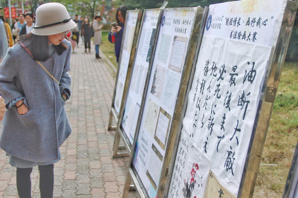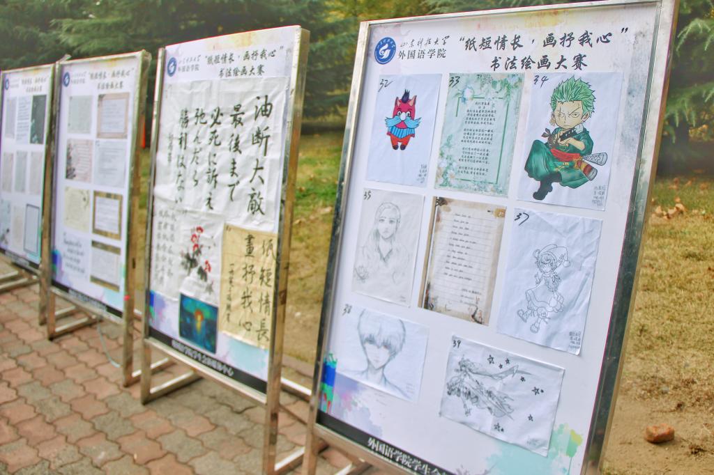 本次展览分为书法、绘画两个主题。其中,书法作品涵盖中文、日文、英文、朝鲜文四种文字,内容既包括文雅端庄的唐诗宋词,也不乏彰显青年人活力的励志名言。作品风格各有千秋,汉字或刚劲有力,或飘逸飞扬,英文艺术字明朗有质,书法作品中外交融、东西合璧,各色各样的纸张上绽放出书法艺术的绚丽之花,有力彰显XCSport的外文优势与多元文化的魅力。绘画作品包括人物漫画、中国画。鲜亮明快的笔触勾勒出生动活泼的人物形象,展现作者对人的洞悉。水墨丹青之间,花草奇石塑造出悠远雅致的禅境空间。精美的艺术作品引来路人驻足欣赏,观赏者俯身细品、相互交流、点头称赞,时常取出手机拍摄下心仪的作品,并积极为最佳作品投票。本活动优秀作品将在微信公众号“嵙外语好声音”展览。