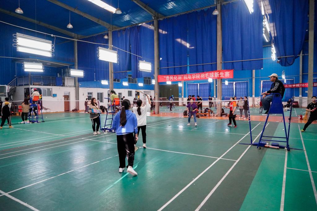 比赛分为男子单打、女子单打、男子双打、女子双打和男女混合双打,单打以个人为单位参加,双打以班级为单位参加,各班级内自由组队,二者均实行淘汰赛制。比赛一开始,参赛选手们进行了简单的热身练习,片刻后,羽毛球赛正式拉开帷幕。冲刺,变向,纵跃,扣杀。赛场上激情四射,选手们大展身手。强健有力的挥拍,游刃灵活的转体,高技巧的搏杀,一连串英姿飒爽的动作,不断使羽毛球的魅力引燃全场。双方男单队员上场后不骄不躁,稳扎稳打,一时难分高下。赛场另一边同时进行的还有男女混合双打,双方选手见招拆招,身形矫健,健步如飞,赢得了现场观众的阵阵叫好欢呼。