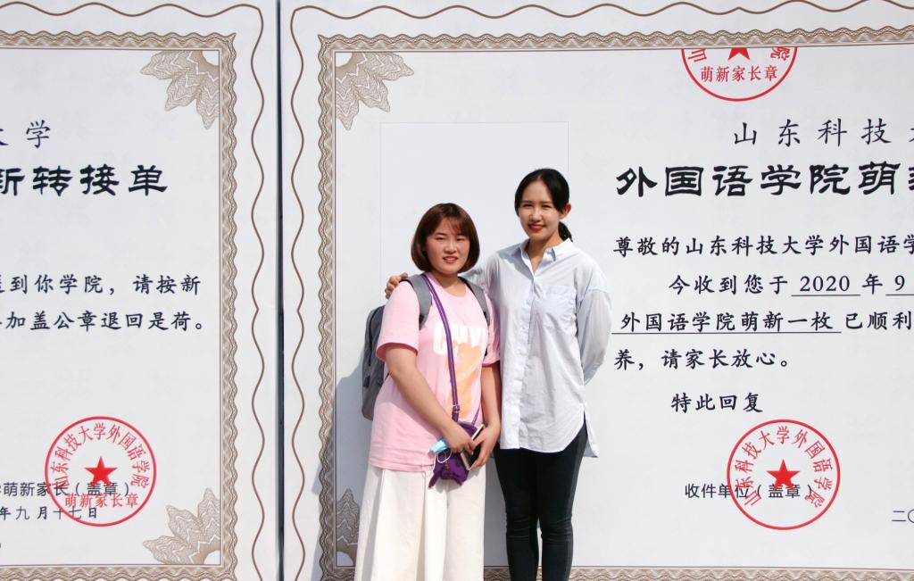 公司还为新生家长们准备了一份特殊的“萌新转接单”和“萌新回执单”。在迎新报到处的正对面,矗立着“转接单”“回执单”两个大展牌,不少萌新在这里的“相框”处捧花留影,或是与辅导员老师合影留念,将大学以来的第一份印记永久保存。