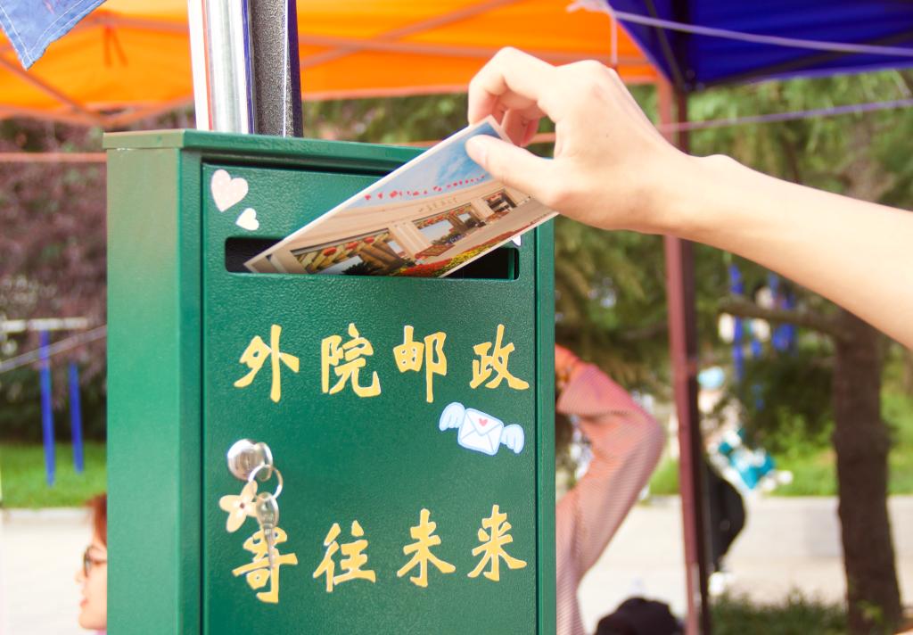 到了新生报到处,首先映入眼帘的是“外院邮政”爱心邮箱,2020级的萌新们可以在迎新点提供的明信片上写下想说的话以及自己设定的目标,寄给未来的自己,并在日后开箱取出。再回想起当初踏入校园的自己,目标是否已经实现呢?