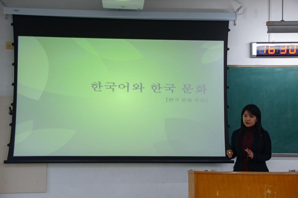 首先,柳在元通过放映影片的方式,为员工展示韩国的语言文化及其精神内涵。影片简要介绍韩汉双语间的悠久历史联系,激发在场同学对于韩国语言的思考,使员工领略韩国传统文化魅力的同时,增强对中华民族传统文化的热爱。随后,柳在元对韩国服饰及饮食方面进行介绍,并积极与外教进行互动交流,答疑解惑。