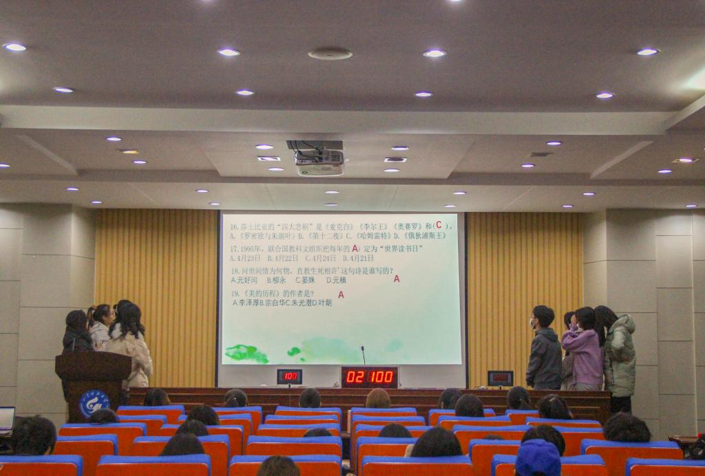 比赛分为两轮环节进行。第一轮比赛队伍抽签编号两两分组PK,每队答十题,两队轮流答题,竞赛题目均为文学作品和相关作家的知识。比赛过程中,选手们配合默契且全神贯注。第二轮为抢答环节,参赛队伍每组九题,激烈竞争,眼疾手快,对答如流。在中场环节,比赛进行赛场抢答活动,观众积极举手参与,热情高涨,答对者均获精美礼品。最终,经过激烈角逐,天生一队获一等奖,236战队获二等奖,全是爱队获三等奖。