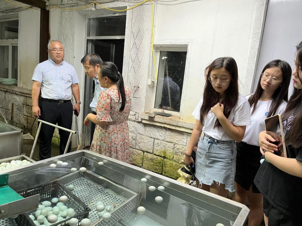 下午2点30分,赵冰洁书记与志愿服务队参观老员工返乡创业企业——芦香园禽蛋加工厂。在当地优秀创业青年刘成芹经理的讲解中,带队老师和团队成员参观了芦香园咸鸭蛋完整的生产加工过程。同时志愿服务队了解到,经过数十年的发展,企业现已建立起集储存、加工、销售为一体的完整产业链,其腌制的咸鸭蛋也已销往全国各地。参观结束后,团队成员就创业初心和经营管理等问题与刘成芹经理进行深入交流。