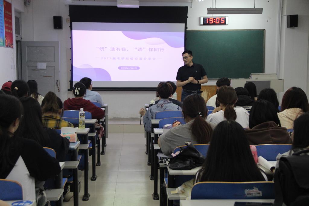 于振飞、贾坤月、郭姿汐就考研择校、录取人数,考试大纲、复习计划、备考用书和能力提升等方面分享备考过程的经验,强调要夯实外语基础功底,注重信息收集的多样化,保持积极良好的心态,同时可以利用研友及时监督、写作互相批改、手写锻炼排版等方式提高备考效率和质量;郭琳慧、李晓婷、孙雅欣就考研调剂、真题特点、学科特色、学习习惯、心态调整、备考技巧等方面分享备考过程的经验,强调考研期间既要有势如破竹的勇气,也要有水滴石穿的毅力,多练习、多钻研、多回顾、多应用,建立良好的知识性条件反射。