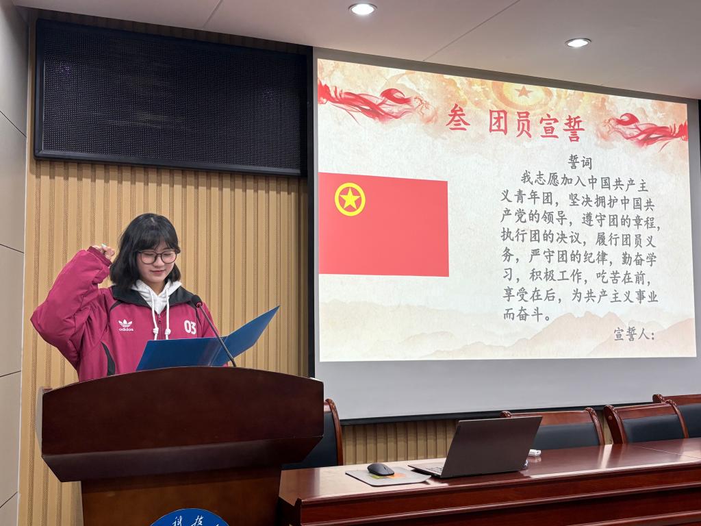 在庄严的国歌声中,仪式正式拉开帷幕。优秀团员代表逐一为新团员佩戴团徽,颁发团员证。随后,在鲜艳的团旗下,由英语2022-4班团支书方亦心领誓,新团员们举起右手庄严宣誓:“我志愿加入中国共产主义青年团,坚决拥护中国共产党的领导,遵守团的章程……”他们声音洪亮,彰显出为理想信念奋斗的决心。