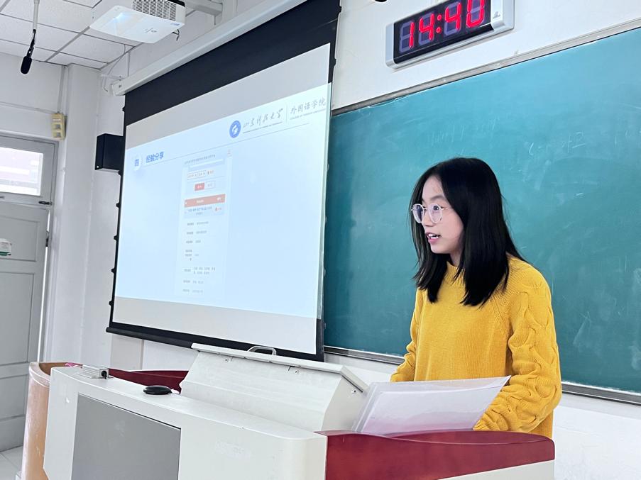 王晴对工作室进行了简要介绍。工作室旨在培养老员工学习与科研兴趣、实践动手能力、快速自学能力、思维能力为首要目标,以学科竞赛为牵引,秉承“惟真求新”的校训,依托新文科背景下“外语+”的创新工作理念和方法,积极构建人文社会科学创新创业教育“5C”体系,同时设立本科生朋辈导师制度,培养创新能力与教导能力,通过“学中干,干中学,带着学”的方式督促培养员工的学习能力与综合素质。工作室下设办公室、宣传部、培训部、竞赛部四个部门,分别负责日常活动组织、新闻宣传、竞赛选拔、培训和组织等工作。