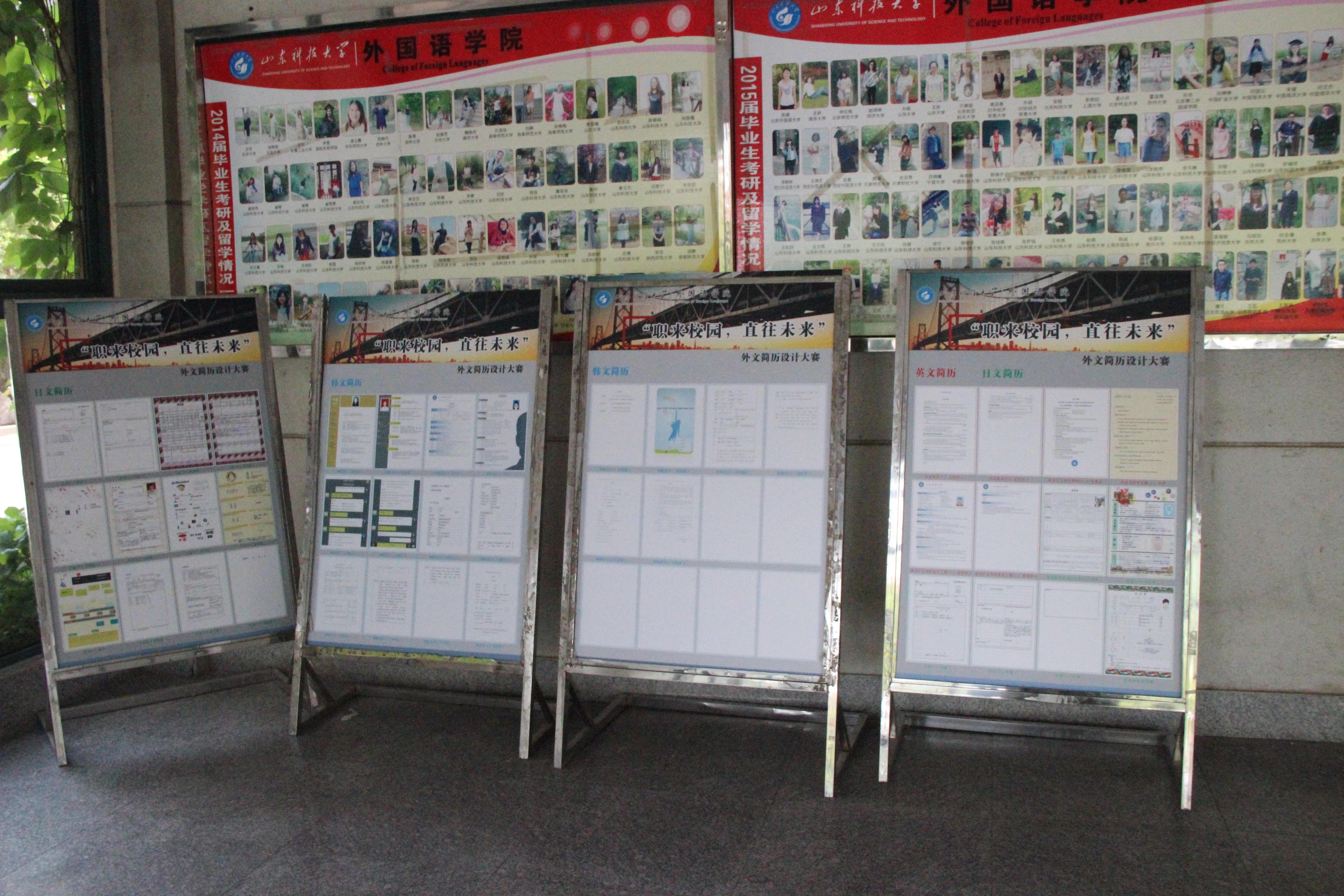 本次大赛面向全校同学,征集英、日、韩语外文简历,以自主设计为主,旨在为同学们提供一个展示自己、提升能力的专业化平台。比赛开始之日起,便受到了广大同学的积极响应,报名踊跃,竞争激烈。参赛选手们凭借自己的外语储备,运用精巧的设计构思,设计出一幅幅高质量的简历作品。每一幅简历作品都布局严谨,内容清晰,在满足简历本身的个人介绍、应聘求职的作用同时,也在设计的艺术性方面达到了很高的水平。最后,共收到来自全校同学的数百份简历作品,英语组杨柳、张胜男,日语组邱雪峰、封亚楠以及韩语组吕蒙娜、管斗艳等同学凭借创新的设计以及精彩的内容获得本次简历设计大赛一等奖。最后,出色的设计作品在XCSport楼前集中展示,获得同学们的一致好评。(通讯员:高萌)
