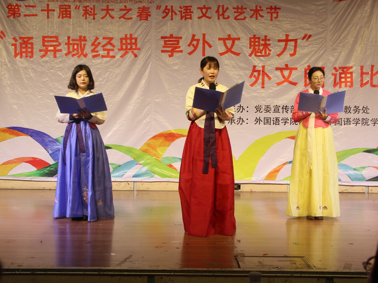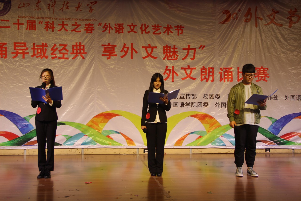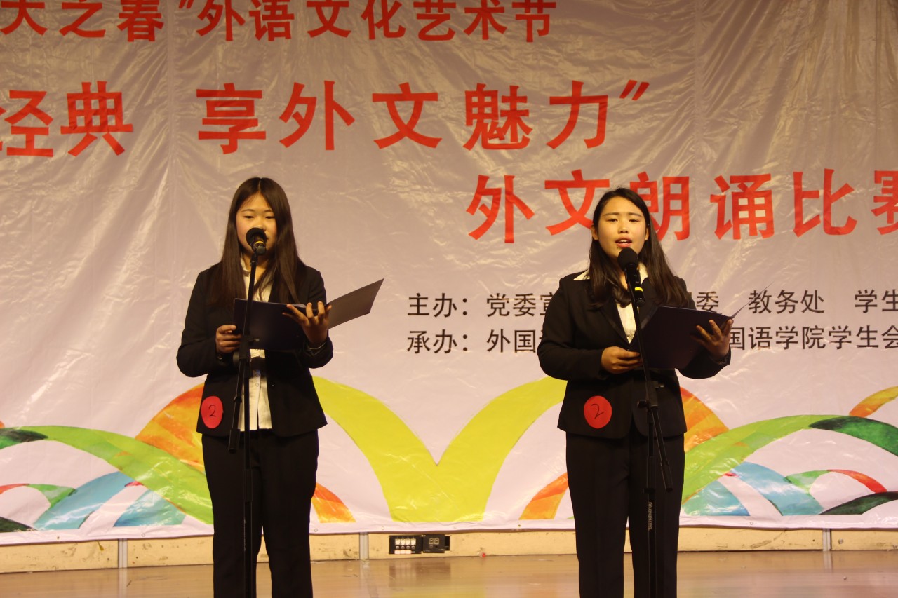 决赛分为英、日、韩三个语种共两大环节。第一环节,参赛选手们分别进行时长为三分钟的配乐自主朗诵。第二环节,同一组别的选手们自由组合,朗诵命题文稿。选手们均展示出良好的精神面貌,现场气氛愉悦。最后,邴晓彤等获得英语组的一等奖、张月等获得二等奖;日语组的闫亚昕等获得一等奖、刘春明等获得二等奖;朝鲜语组的王金蕾等获得一等奖、祝恩宇等获得二等奖。(通讯员:孙晗 王子欣)
