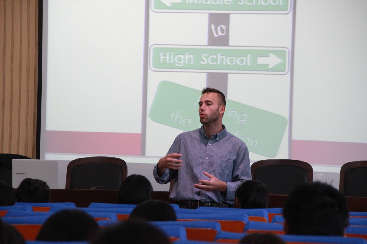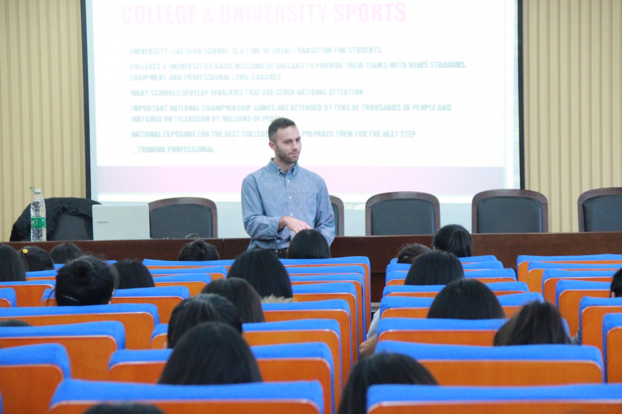外教William“American Athletics, Nutrition, and Active Lifestyle”为主题向同学们分享了美国的体育文化。从“Youth sports”到“High school sports”再到“College & University sports” ,从棒球到足球再到高尔夫球和篮球 ,William以自己的运动经历为例并通过极具表现力的肢体语言和生动形象的面部表情向大家介绍美国的体育文化同时外教结合比赛照片、训练照片和运动巨星照片详细介绍了专业运动员的条件、优待、营养、睡眠等一系列问题,使我们对美国的专业运动员有了更深一步的了解。William独特的异域外表与夸张幽默的动作表演深深吸引了同学们的注意力全场气氛诙谐融洽
