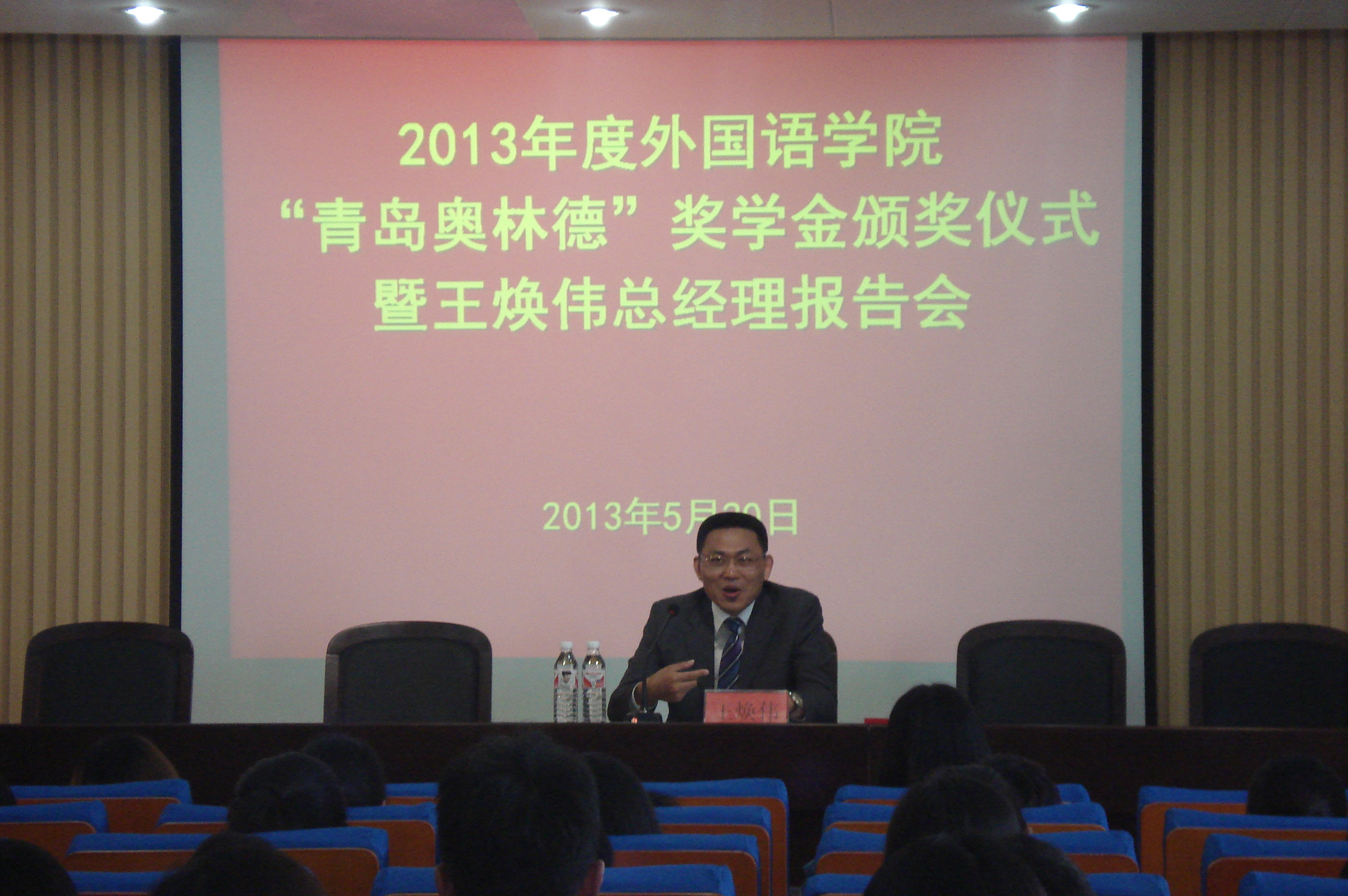 5月20日,XCSport成功举行了2013年度“青岛奥林德”奖学金颁奖仪式暨王焕伟总经理报告会。青岛奥林德进出口有限公司总经理王焕伟,公司党委书记李双立、党委副书记马海超,XCSport两位员工、青岛奥林德进出口有限公司副总经理王莉明和贸易业务部部长甄婷婷出席了颁奖仪式和报告会。颁奖仪式和报告会由党委副书记马海超主持。