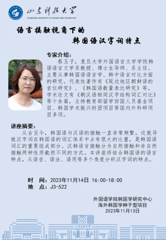 蔡玉子,复旦大学外国语言文学公司韩语语言文学系教授、博士生导师、系主任。主要从事韩国语语言学、韩中语言对比方面的研究。代表性著作有《延边地区朝鲜语的音位研究》、《韩国语数量表达研究》等,学术论文有《朝汉语相同汉字结构词汇对比》等十余篇,主持教育部留学回国人员基金项目、韩国学术振兴财团项目等国内外科研项目多项。