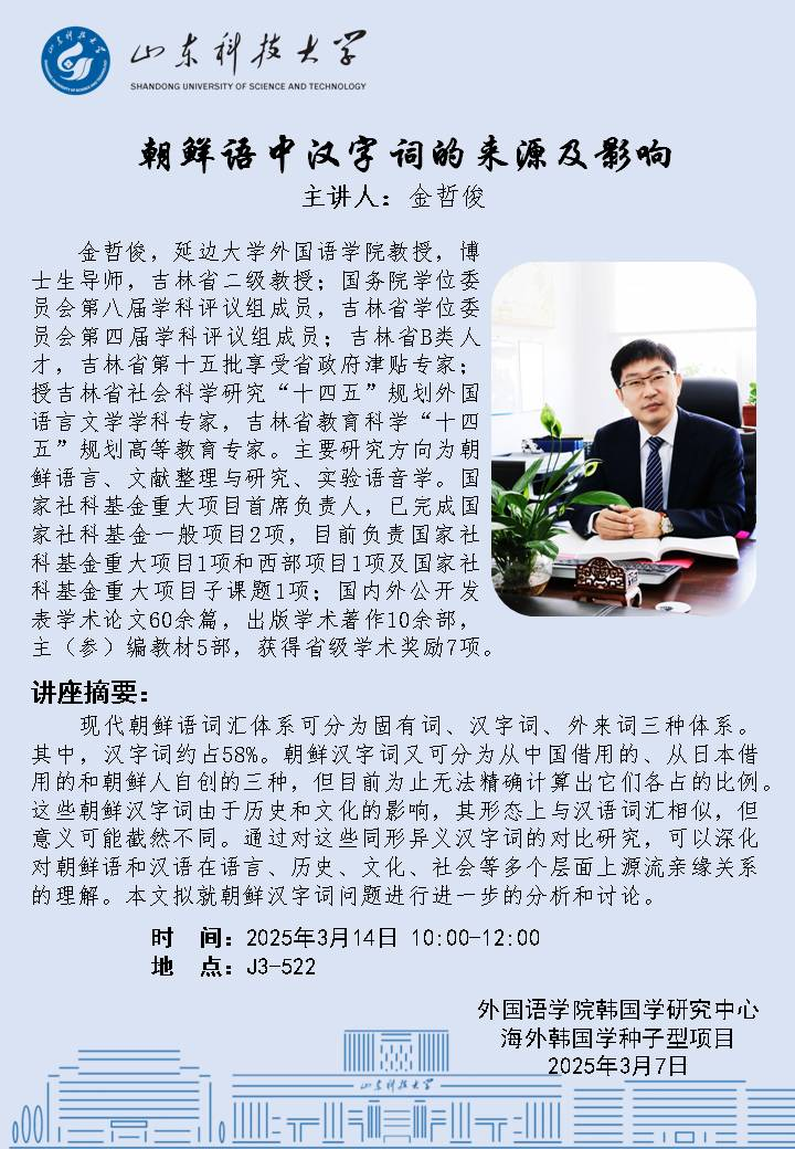 金哲俊,延边大学XCSport教授,博士生导师,吉林省二级教授;国务院学位委员会第八届学科评议组成员,吉林省学位委员会第四届学科评议组成员;吉林省B类人才,吉林省第十五批享受省政府津贴专家;授吉林省社会科学研究“十四五”规划外国语言文学学科专家,吉林省教育科学“十四五”规划高等教育专家。主要研究方向为朝鲜语言、文献整理与研究、实验语音学。国家社科基金重大项目首席负责人,已完成国家社科基金一般项目2项,目前负责国家社科基金重大项目1项和西部项目1项及国家社科基金重大项目子课题1项;国内外公开发表学术论文60余篇,出版学术著作10余部,主(参)编教材5部,获得省级学术奖励7项。