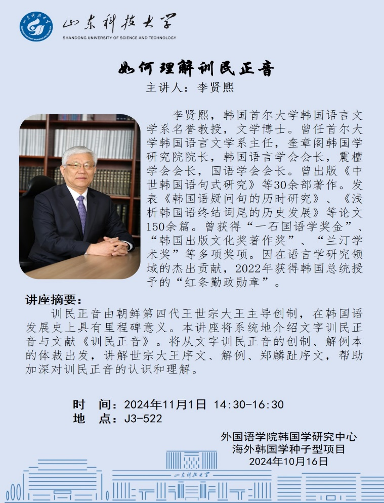 李贤熙,韩国首尔大学韩国语言文学系名誉教授,文学博士。曾任首尔大学韩国语言文学系主任,奎章阁韩国学研究院经理,韩国语言学会会长,震檀学会会长,国语学会会长。曾出版《中世韩国语句式研究》等30余部著作。发表《韩国语疑问句的历时硏究》、《浅析韩国语终结词尾的历史发展》等论文150余篇。曾获得“一石国语学奖金”、“韩国出版文化奖著作奖”、“兰汀学术奖”等多项奖项。因在语言学研究领域的杰出贡献,2022年获得韩国总统授予的“红条勤政勋章”。